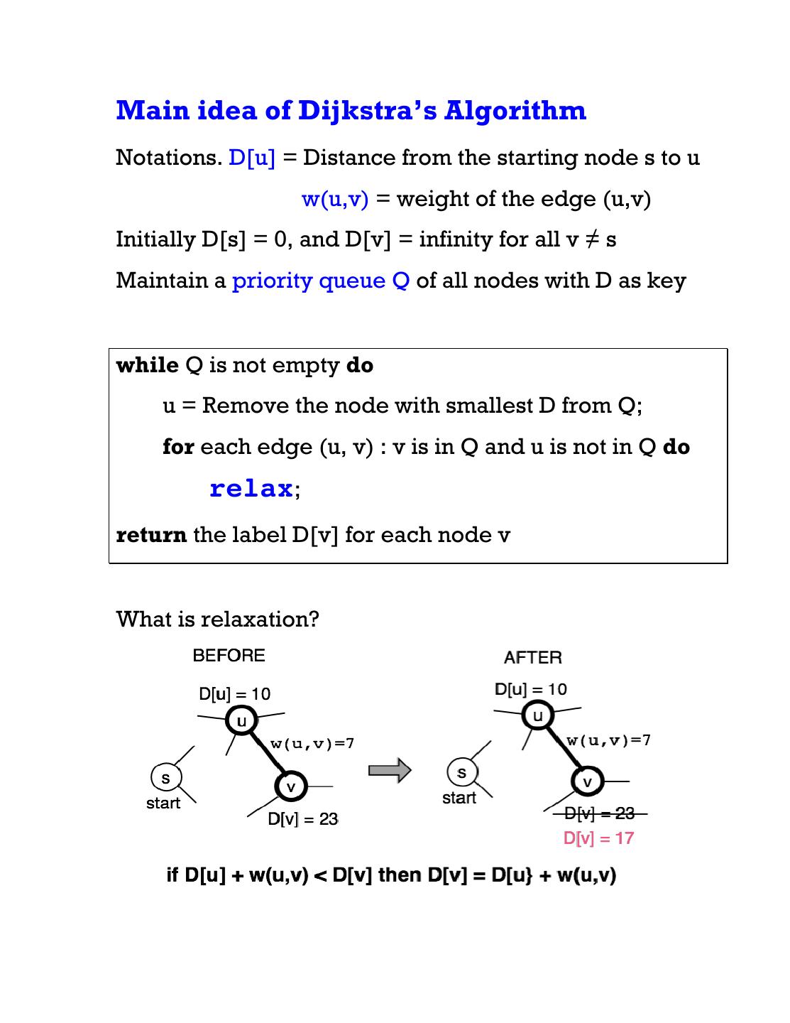 25 .Main idea of Dijkstra’s Algorithm Notations. D[u] = Distance from the starting node s to u w(u,v) = weight of the edge (u,v) Initially D[s] = 0, and D[v] = infinity for all v ≠ s Maintain a priority queue Q of all nodes with D as key while Q is not empty do u = Remove the node with smallest D from Q; for each edge (u, v) : v is in Q and u is not in Q do relax; return the label D[v] for each node v What is relaxation?