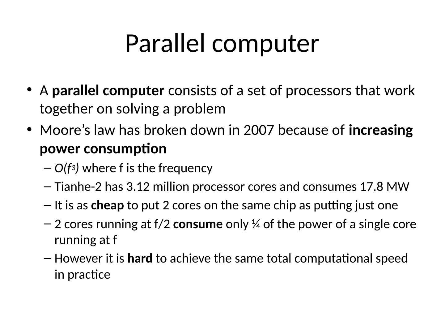 2 .Parallel computer A parallel computer consists of a set of processors that work together on solving a problem Moore’s law has broken down in 2007 because of increasing power consumption O(f 3 ) where f is the frequency Tianhe-2 has 3.12 million processor cores and consumes 17.8 MW It is as cheap to put 2 cores on the same chip as putting just one 2 cores running at f/2 consume only ¼ of the power of a single core running at f However it is hard to achieve the same total computational speed in practice