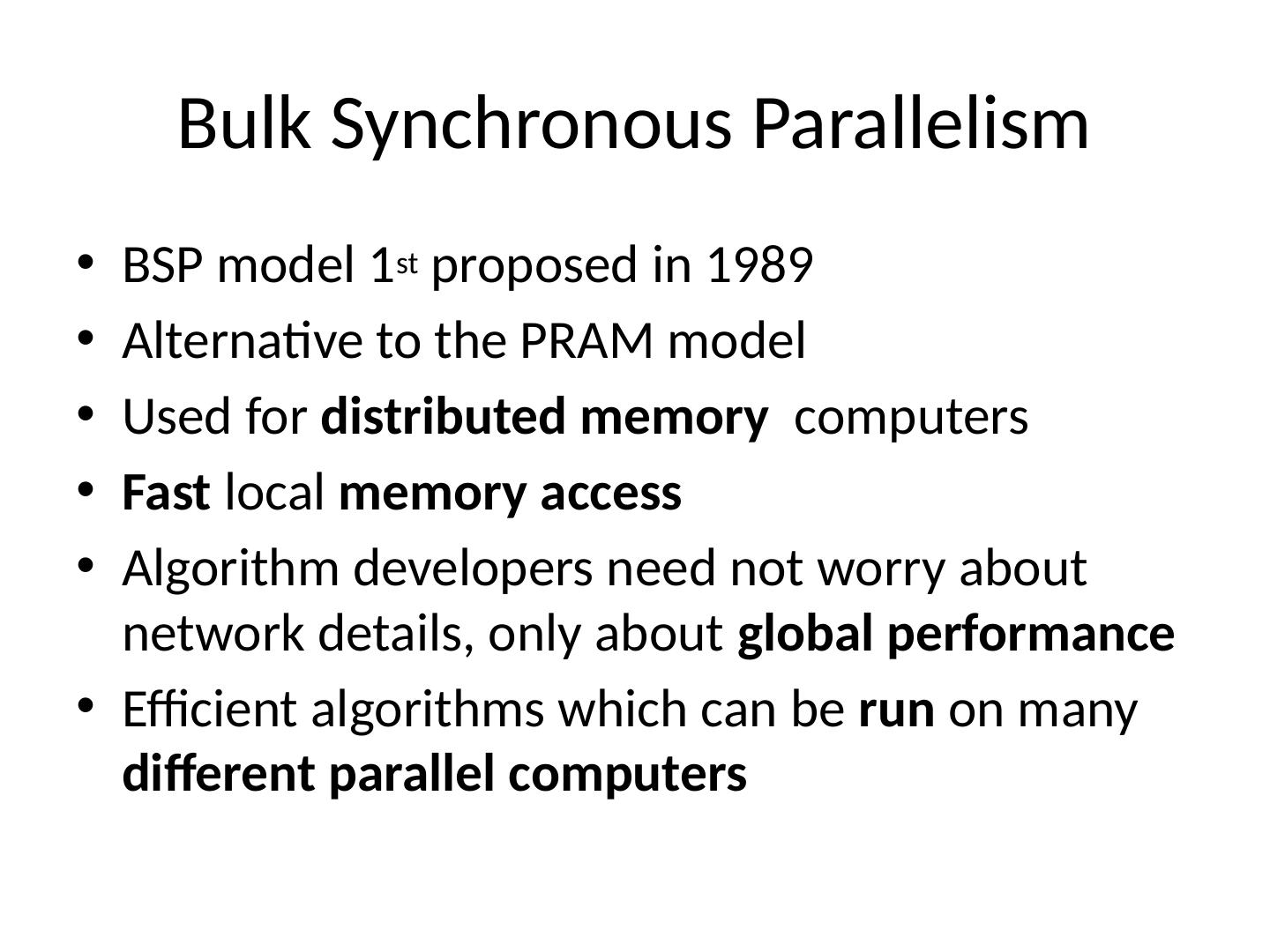 3 .Bulk Synchronous Parallelism BSP model 1 st proposed in 1989 Alternative to the PRAM model Used for distributed memory computers Fast local memory access Algorithm developers need not worry about network details, only about global performance Efficient algorithms which can be run on many different parallel computers