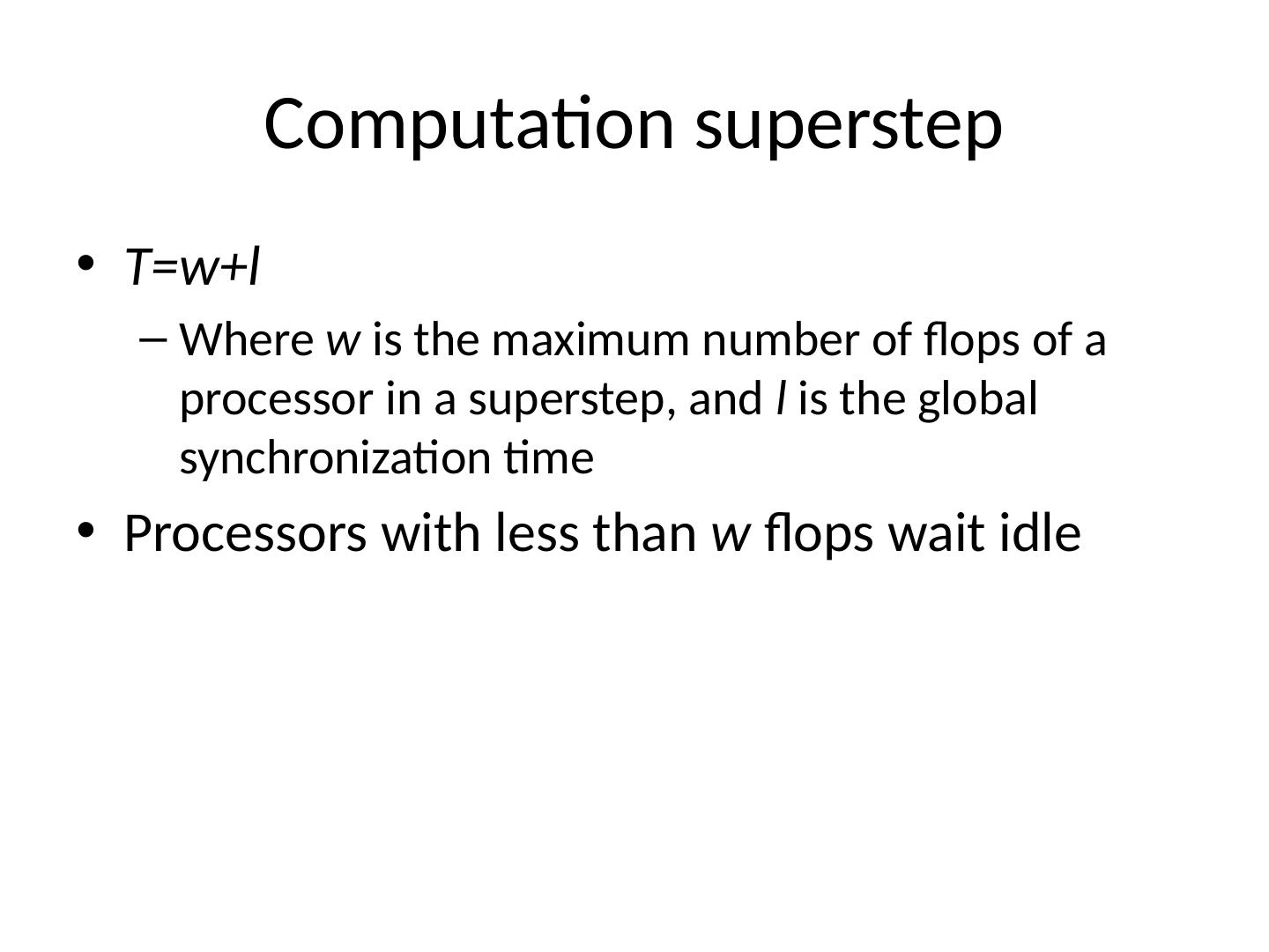 8 .Computation superstep T= w+l Where w is the maximum number of flops of a processor in a superstep , and l is the global synchronization time Processors with less than w flops wait idle