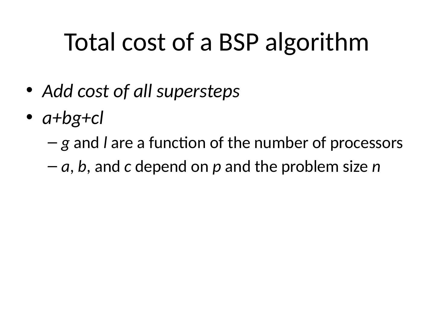 9 .Total cost of a BSP algorithm Add cost of all supersteps a+bg+cl g and l are a function of the number of processors a , b , and c depend on p and the problem size n
