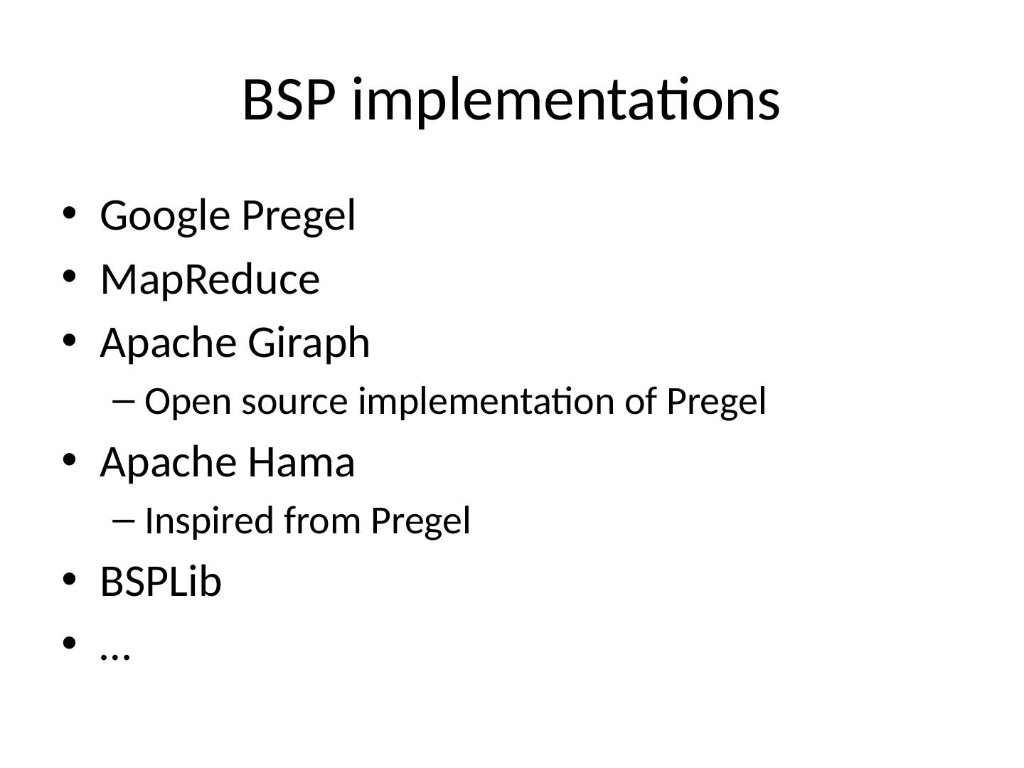 10 .BSP implementations Google Pregel MapReduce Apache Giraph Open source implementation of Pregel Apache Hama Inspired from Pregel BSPLib …