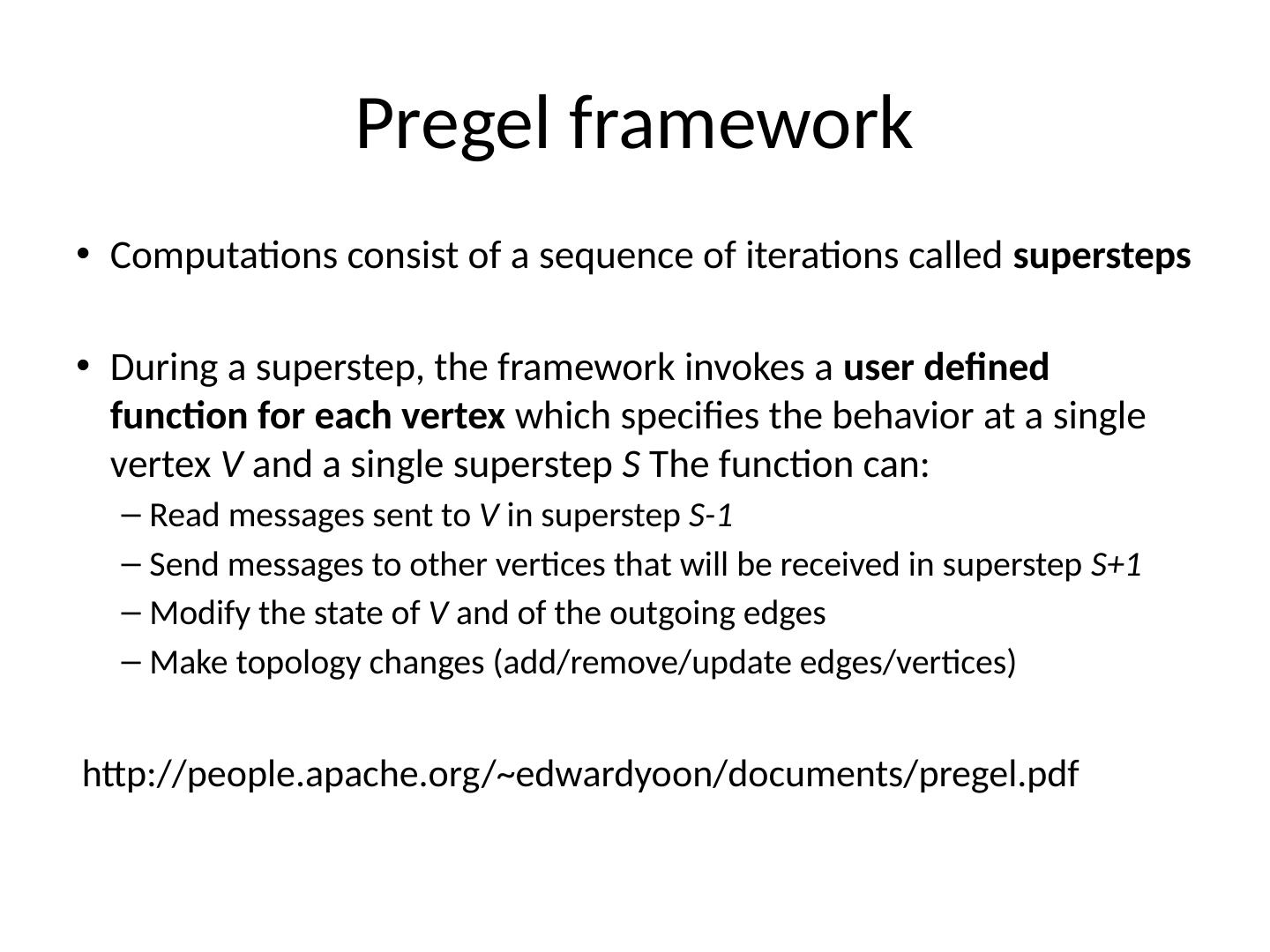 11 .Pregel framework Computations consist of a sequence of iterations called supersteps During a superstep , the framework invokes a user defined function for each vertex which specifies the behavior at a single vertex V and a single superstep S The function can: Read messages sent to V in superstep S-1 Send messages to other vertices that will be received in superstep S+1 Modify the state of V and of the outgoing edges Make topology changes (add/remove/update edges/vertices) http ://people.apache.org/~edwardyoon/documents/pregel.pdf