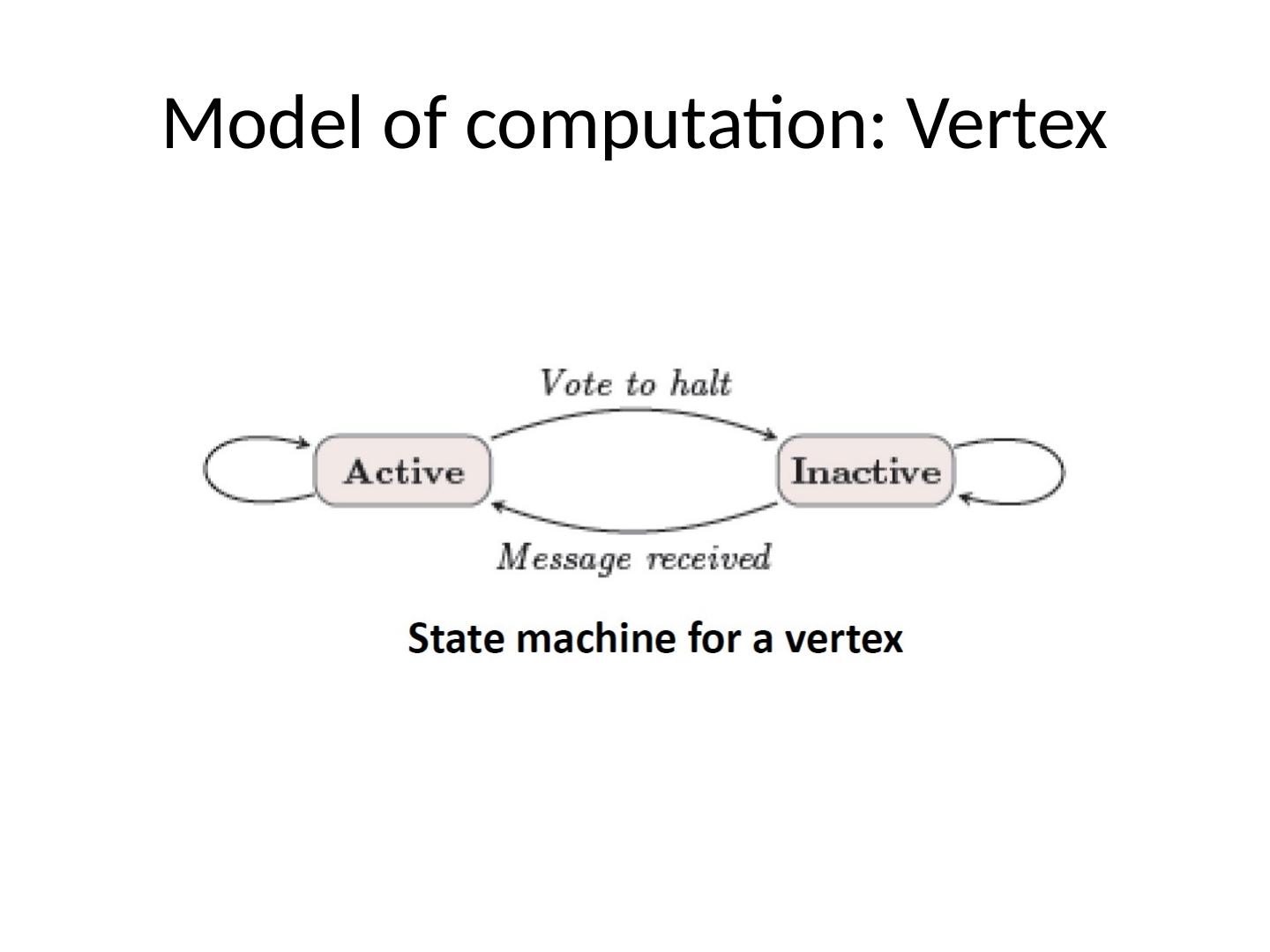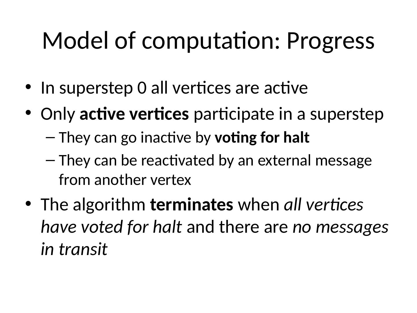 12 .Model of computation: Progress I n superstep 0 all vertices are active Only active vertices participate in a superstep They can go inactive by voting for halt They can be reactivated by an external message from another vertex The algorithm terminates when all vertices have voted for halt and there are no messages in transit
