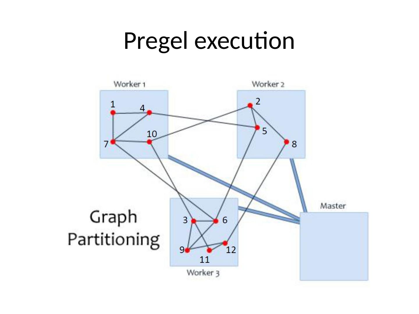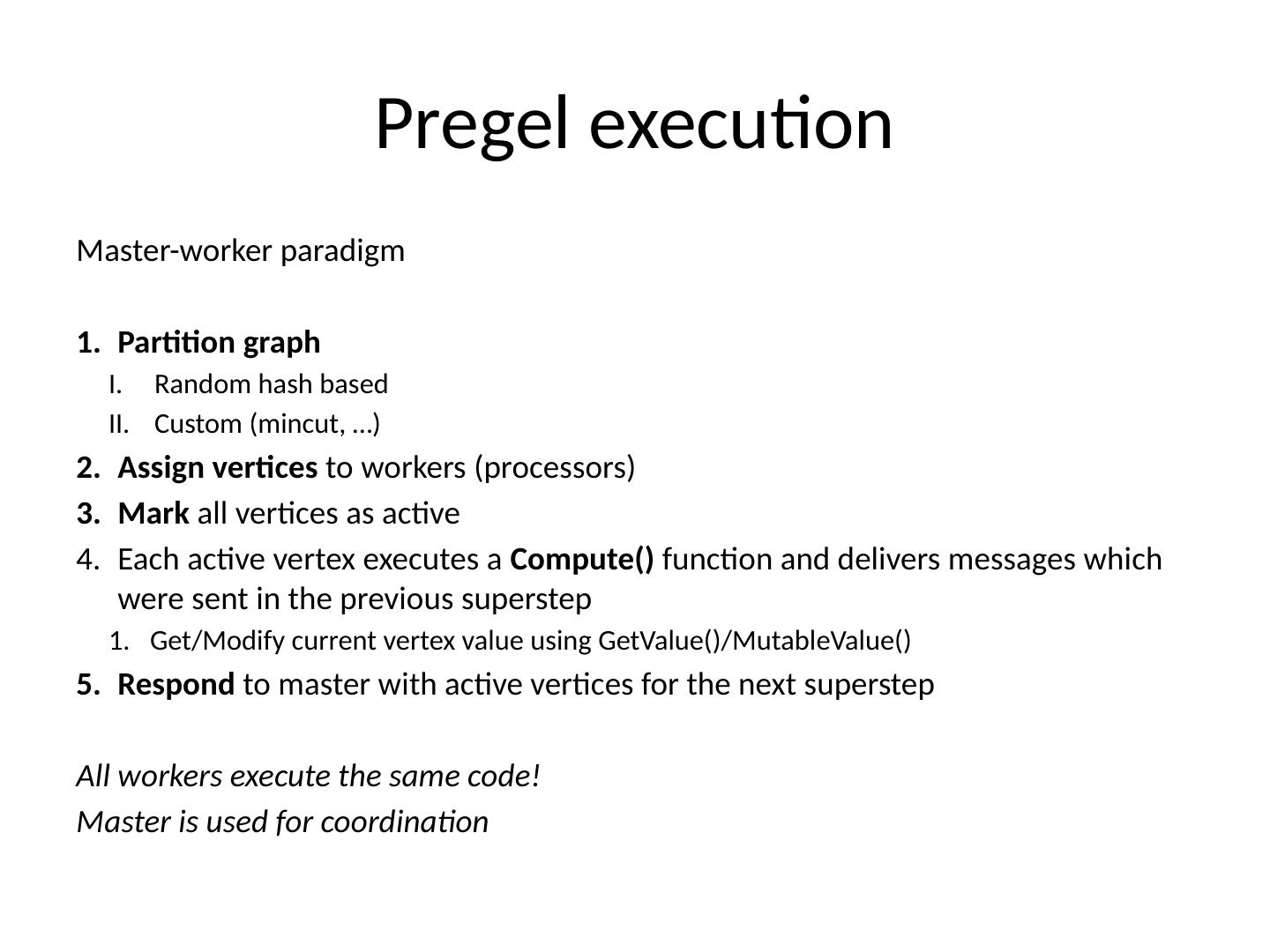 15 .Pregel execution Master-worker paradigm Partition graph Random hash based Custom ( mincut , …) Assign vertices to workers (processors) Mark all vertices as active Each active vertex executes a Compute() function and delivers messages which were sent in the previous superstep Get/Modify current vertex value using GetValue ()/ MutableValue () Respond to master with active vertices for the next superstep All workers execute the same code! Master is used for coordination