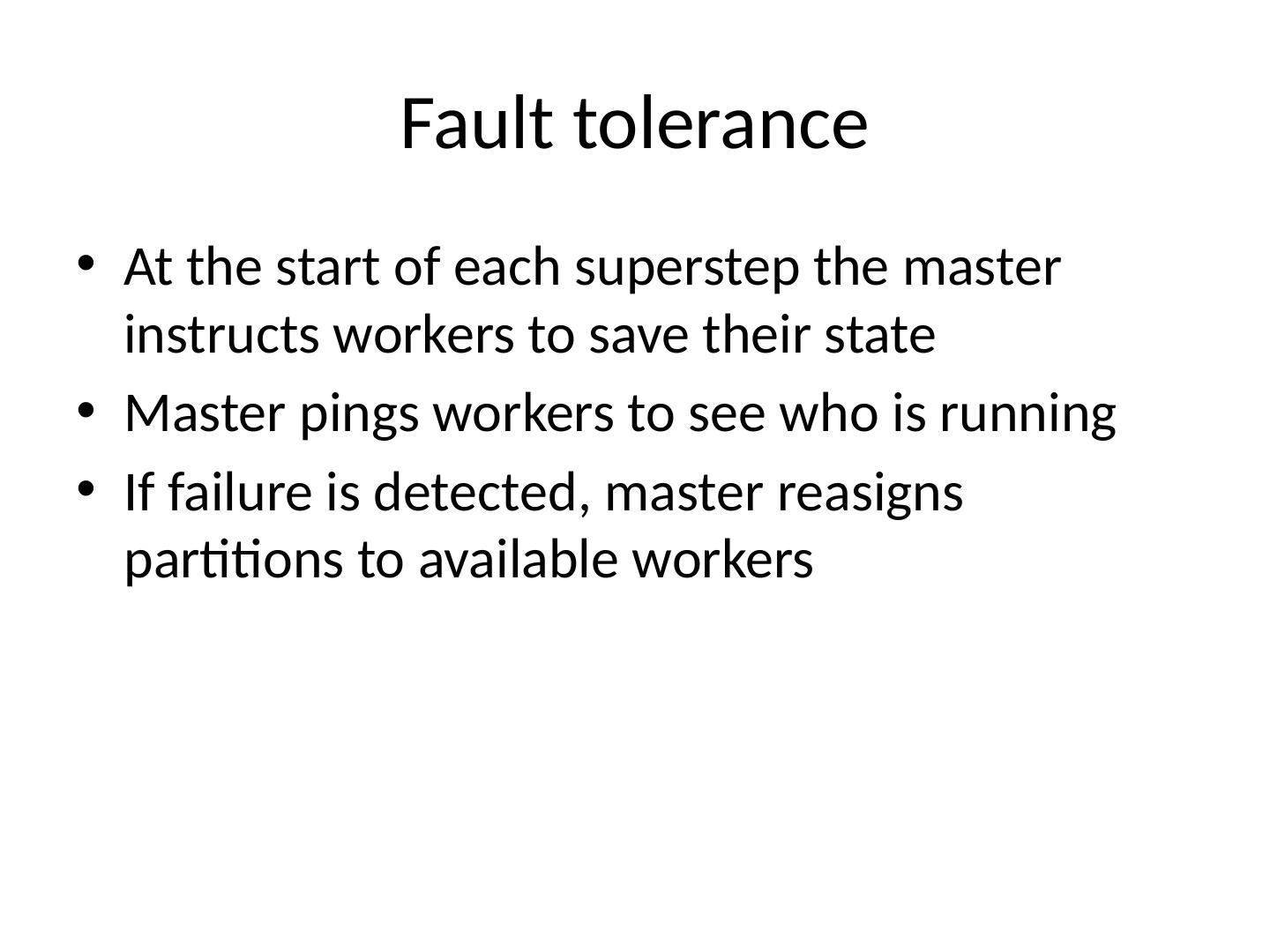 16 .Fault tolerance At the start of each superstep the master instructs workers to save their state Master pings workers to see who is running If failure is detected, master reasigns partitions to available workers