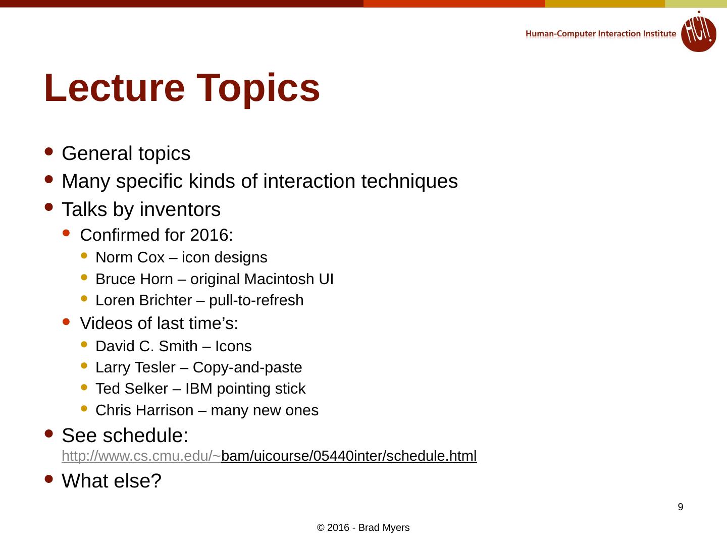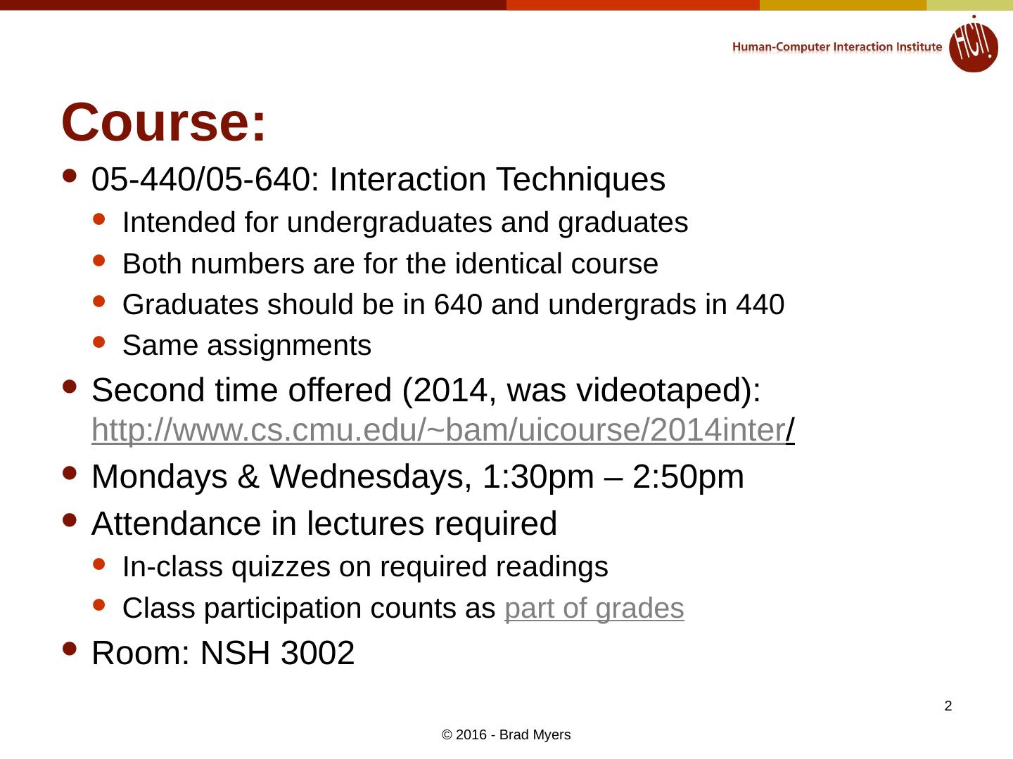 1 .1 05-440/05-640: Interaction Techniques, Spring , 2016 http://www.cs.cmu.edu/~bam/uicourse/05440inter / Brad Myers Human Computer Interaction Institute Lecture 1 Spring, 2016 © 2016 - Brad Myers
