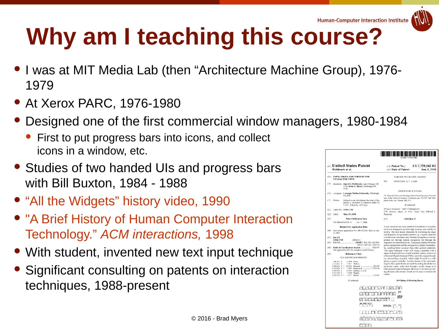 6 .Why am I teaching this course? I was at MIT Media Lab (then “Architecture Machine Group), 1976-1979 At Xerox PARC, 1976-1980 Designed one of the first commercial window managers, 1980-1984 First to put progress bars into icons, and collect icons in a window, etc. Studies of two handed UIs and progress bars with Bill Buxton, 1984 - 1988 “All the Widgets” history video, 1990 "A Brief History of Human Computer Interaction Technology.” ACM interactions, 1998 With student, invented new text input technique Significant consulting on patents on interaction techniques, 1988-present © 2016 - Brad Myers 6