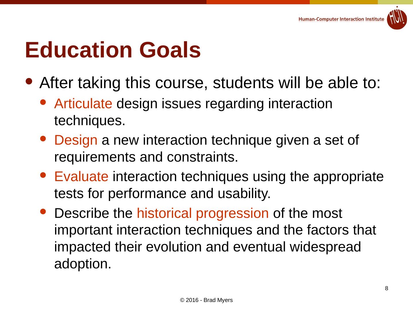 8 .Education Goals After taking this course, students will be able to: Articulate design issues regarding interaction techniques. Design a new interaction technique given a set of requirements and constraints. Evaluate interaction techniques using the appropriate tests for performance and usability. Describe the historical progression of the most important interaction techniques and the factors that impacted their evolution and eventual widespread adoption. © 2016 - Brad Myers 8