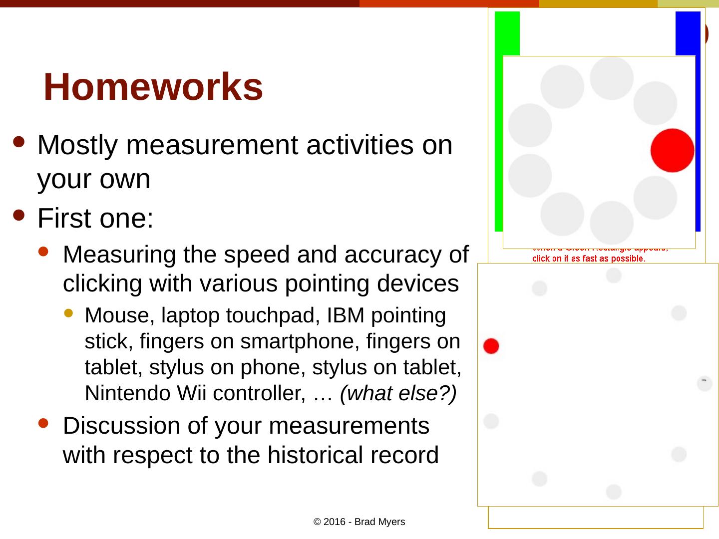 11 .Homeworks Mostly measurement activities on your own First one: Measuring the speed and accuracy of clicking with various pointing devices Mouse, laptop touchpad, IBM pointing stick, fingers on smartphone , fingers on tablet, stylus on phone, stylus on tablet, Nintendo Wii controller, … (what else?) Discussion of your measurements with respect to the historical record © 2016 - Brad Myers 11