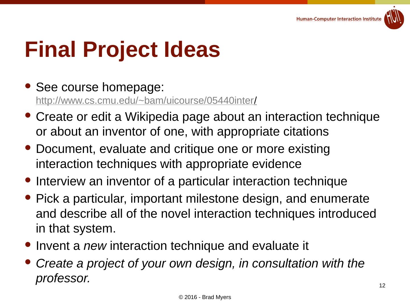 12 .Final Project Ideas See course homepage: http://www.cs.cmu.edu/~bam/uicourse/05440inter / Create or edit a Wikipedia page about an interaction technique or about an inventor of one, with appropriate citations Document, evaluate and critique one or more existing interaction techniques with appropriate evidence Interview an inventor of a particular interaction technique Pick a particular, important milestone design, and enumerate and describe all of the novel interaction techniques introduced in that system. Invent a new interaction technique and evaluate it Create a project of your own design, in consultation with the professor. © 2016 - Brad Myers 12
