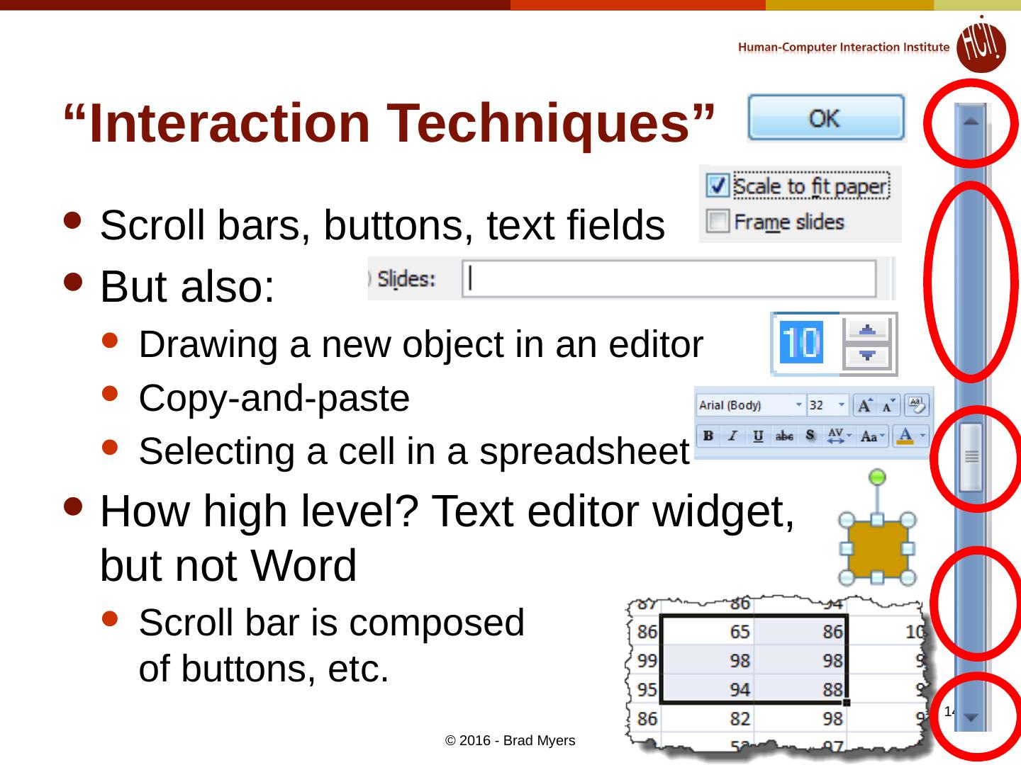 14 .“Interaction Techniques” Scroll bars, buttons, text fields But also: Drawing a new object in an editor Copy-and-paste Selecting a cell in a spreadsheet How high level? Text editor widget, but not Word Scroll bar is composed of buttons, etc. © 2016 - Brad Myers 14