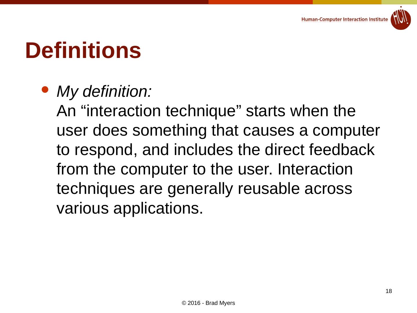 18 .Definitions My definition: An “interaction technique” starts when the user does something that causes a computer to respond, and includes the direct feedback from the computer to the user. Interaction techniques are generally reusable across various applications. © 2016 - Brad Myers 18