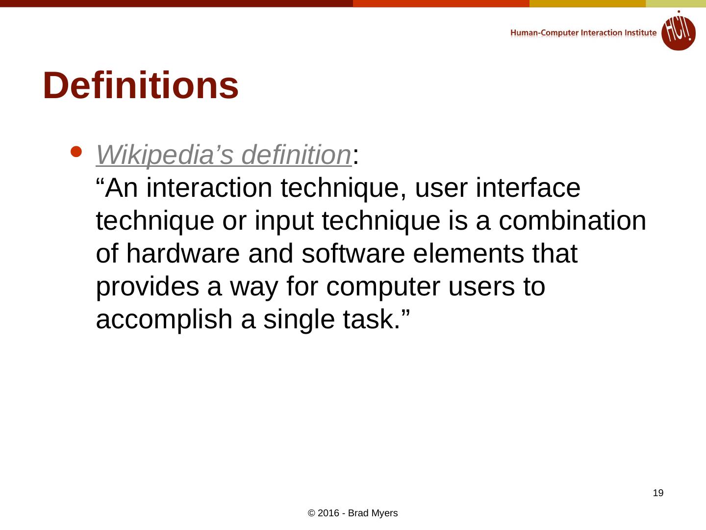 19 .Definitions Wikipedia’s definition : “An interaction technique, user interface technique or input technique is a combination of hardware and software elements that provides a way for computer users to accomplish a single task.” © 2016 - Brad Myers 19