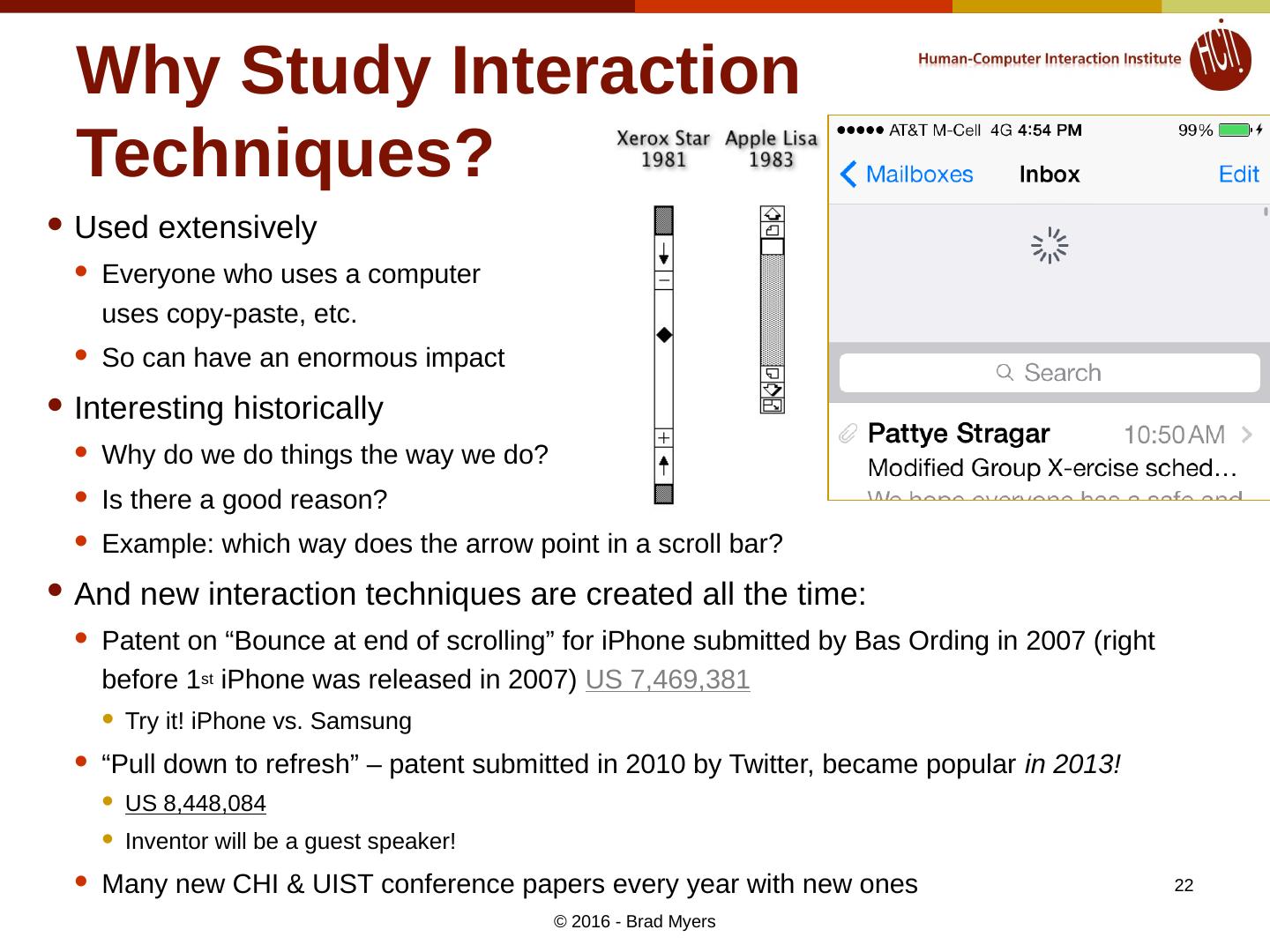 23 .Why Study Interaction Techniques, cont. Interaction Techniques have a high economic value Often the subject of patents and lawsuits Can’t patent overall look and feel “Apple Wins Over Jury in Samsung Patent Dispute, Awarded $1.05 Billion in Damages (Live Blog)” link “Jury orders Samsung to pay $290M to Apple in patent case” link Need new ones “Desktop metaphor” is getting tired Macs & PCs look and work pretty similar to each other and to the designs of the 1980’s (30 years ago) Text entry on smartphones is a big barrier Selecting individual elements, characters on smartphones © 2016 - Brad Myers 23