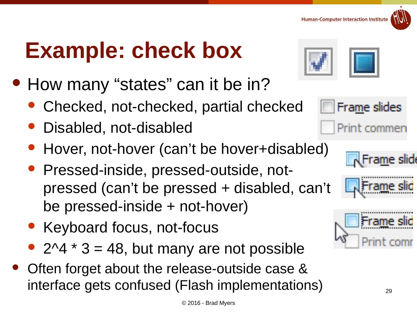 29 .Example: check box How many “states” can it be in? Checked, not-checked, partial checked Disabled, not-disabled Hover, not-hover (can’t be hover+disabled ) Pressed-inside, pressed-outside, not-pressed (can’t be pressed + disabled, can’t be pressed-inside + not-hover) Keyboard focus, not-focus 2^4 * 3 = 48, but many are not possible Often forget about the release-outside case & interface gets confused (Flash implementations) © 2016 - Brad Myers 29
