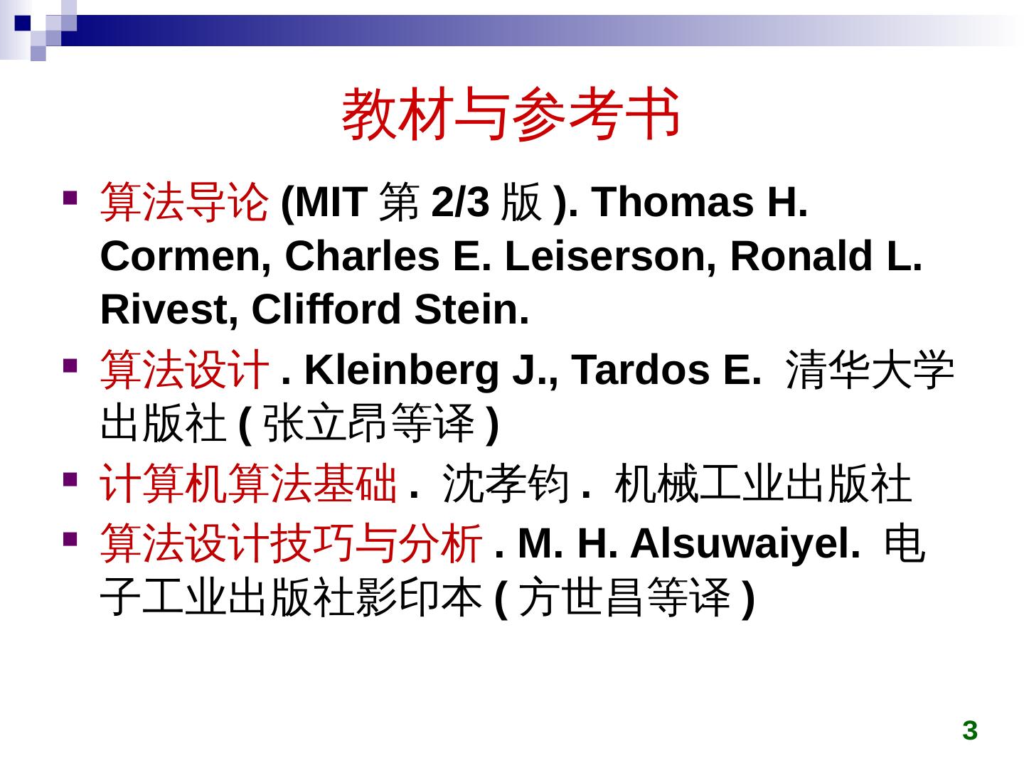 3 .教材与参考书 算法导论 (MIT 第 2/3 版 ). Thomas H. Cormen , Charles E. Leiserson , Ronald L. Rivest , Clifford Stein. 算法设计 . Kleinberg J., Tardos E. 清华大学出版社 ( 张立昂等译 ) 计算机算法基础 . 沈孝钧 . 机械工业出版社 算法设计技巧与分析 . M. H. Alsuwaiyel . 电子工业出版社影印本 ( 方世昌等译 ) 3