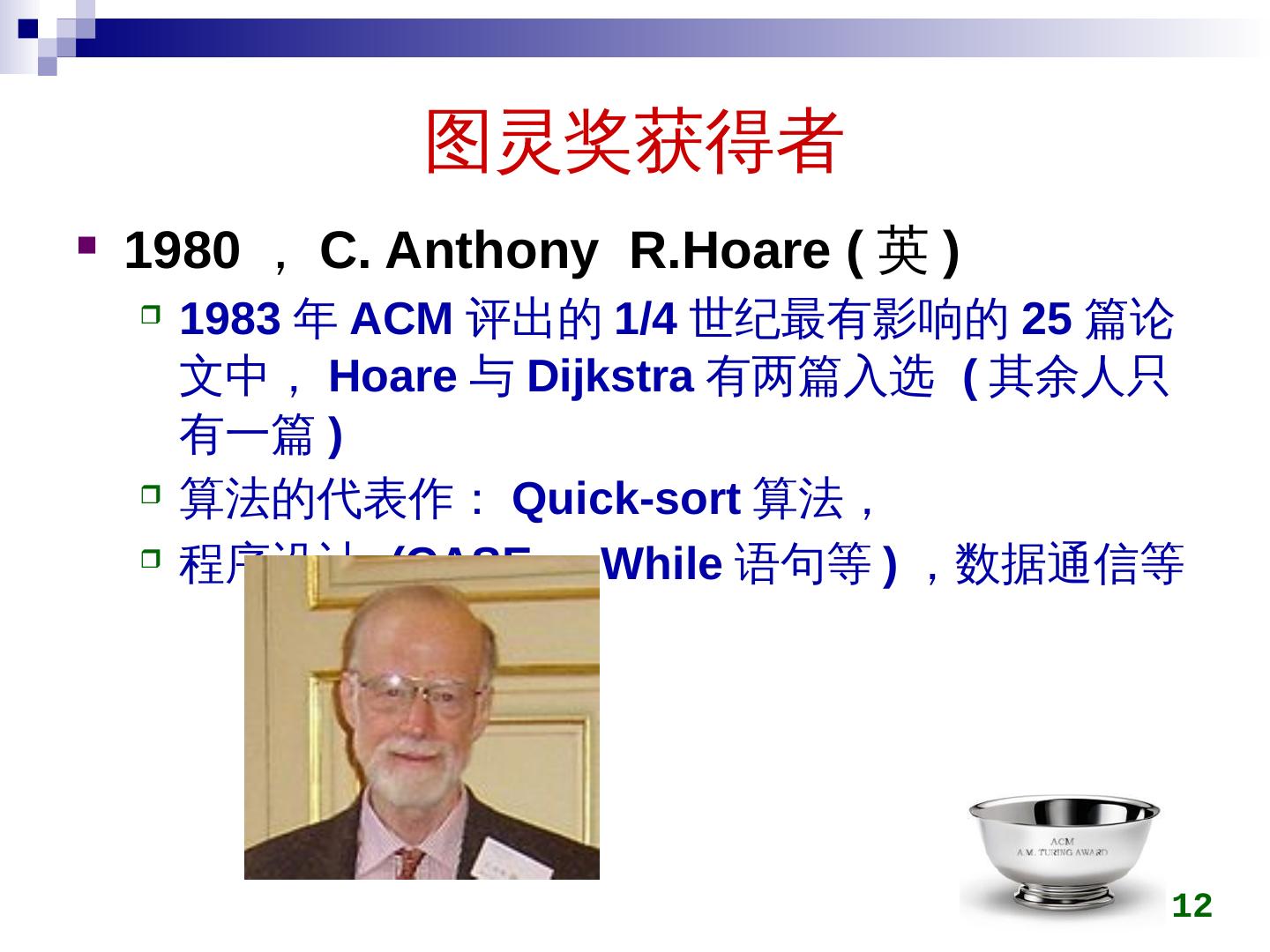 12 .图灵奖获得者 1980 , C. Anthony R.Hoare ( 英 ) 1983 年 ACM 评出的 1/4 世纪最有影响的 25 篇论文 中, Hoare 与 Dijkstra 有两篇入选 ( 其余人只有一篇 ) 算法的代表作: Quick-sort 算法, 程序设计 (CASE 、 While 语句等 ) ,数据通信 等 12