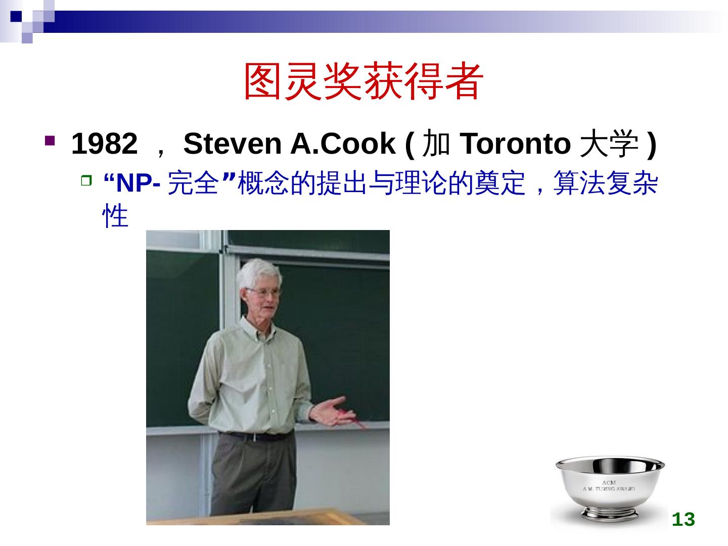 13 .图灵奖获得者 1982 , Steven A.Cook ( 加 Toronto 大学 ) “NP- 完全 ” 概念的提出与理论的奠定,算法复杂性 13