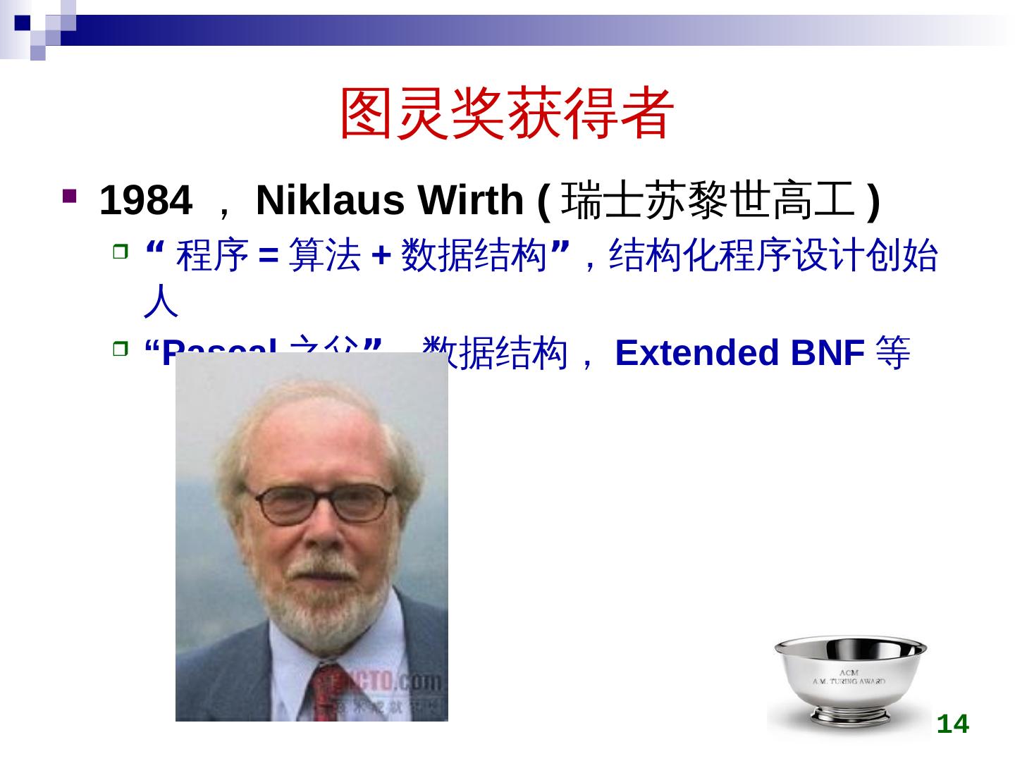 14 .图灵奖获得者 1984 , Niklaus Wirth ( 瑞士苏黎世高工 ) “ 程序 = 算法 + 数据结构 ” ,结构化程序设计创始人 “Pascal 之父 ”, 数据结构, Extended BNF 等 14