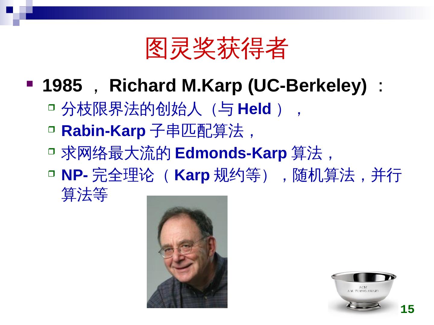 15 .图灵奖获得者 1985 , Richard M.Karp (UC-Berkeley) : 分枝限界法的创始人(与 Held ), Rabin-Karp 子串匹配算法, 求网络最大流的 Edmonds-Karp 算法, NP- 完全理论( Karp 规约等),随机算法,并行算法等 15