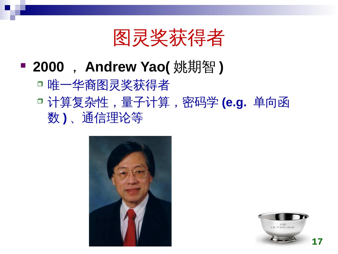 17 .图灵奖获得者 2000 , Andrew Yao( 姚期智 ) 唯一华裔图灵奖获得者 计算复杂性,量子计算,密码学 (e.g. 单向函数 ) 、通信理论 等 17