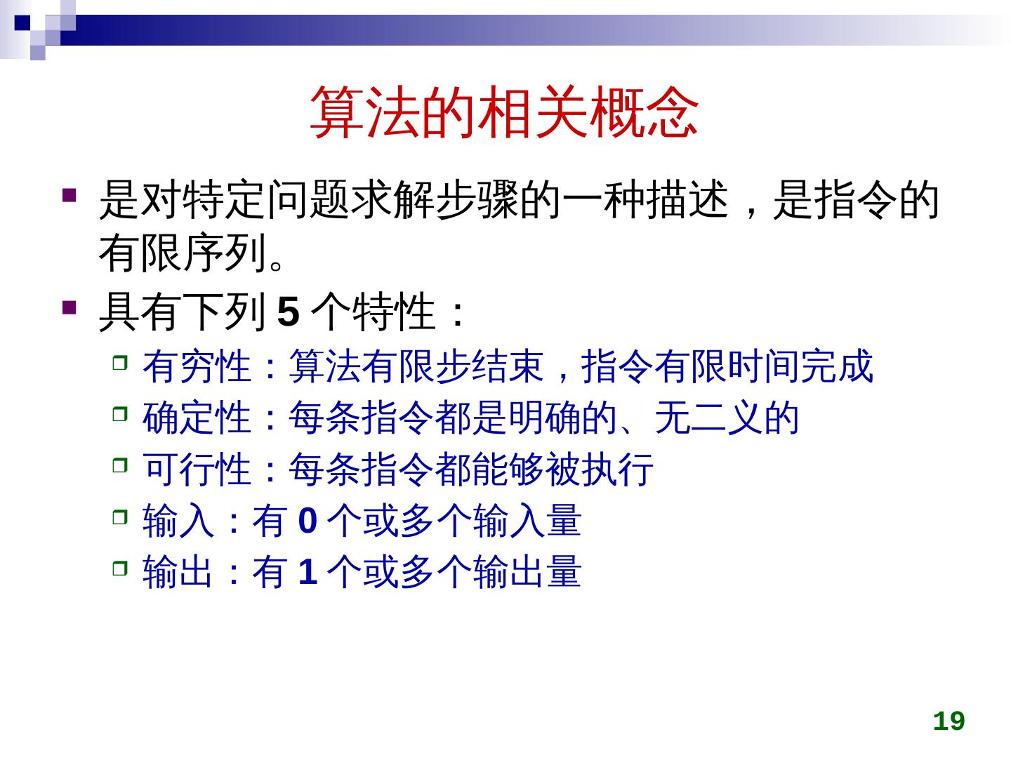 19 .算法的相关概念 是对特定问题求解步骤的一种描述,是指令的有限序列。 具有下列 5 个特性: 有穷性:算法有限步结束,指令有限时间完成 确定性:每条指令都是明确的、无二义的 可行性:每条指令都能够被执行 输入:有 0 个或多个输入量 输出:有 1 个或多个输出量 19