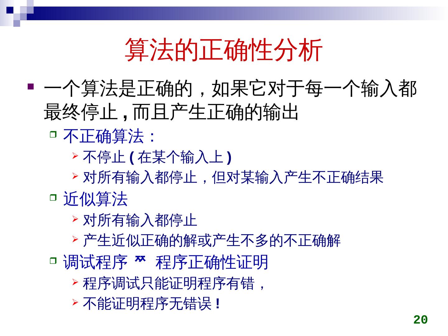 20 .算法的正确性分析 一个算法是正确的,如果它对于每一个输入都最终停止,而且产生正确的输出 不正确算法 : 不停止(在某个输入上) 对所有输入都停止,但对某输入产生不正确结果 近似算法 对所有输入都停止 产生近似正确的解或产生不多的不正确解 调试程序 程序正确性证明 程序调试只能证明程序有错, 不能证明程序无错误 ! 20