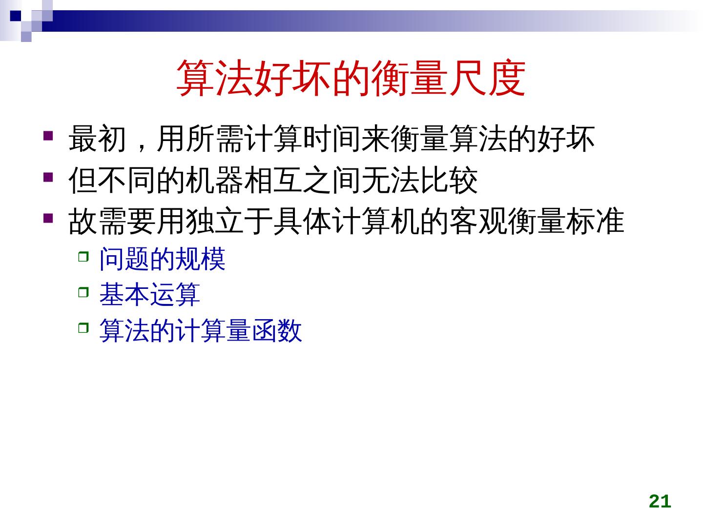 21 .算法好坏的衡量尺度 最初,用所需计算时间来衡量算法的好坏 但不同的机器相互之间无法比较 故需要用独立于具体计算机的客观衡量标准 问题的规模 基本运算 算法的计算量函数 21