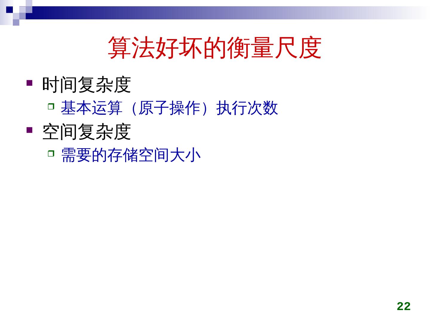 22 .算法好坏的衡量尺度 时间复杂度 基本运算(原子操作)执行次数 空间复杂度 需要的存储空间大小 22