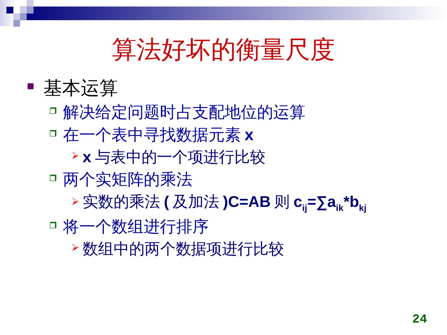 24 .算法好坏的衡量尺度 基本运算 解决给定问题时占支配地位的运算 在一个表中寻找数据元素 x x 与表中的一个项进行比较 两个实矩阵的乘法 实数的乘法 ( 及加法 )C=AB 则 c ij =∑a ik *b kj 将一个数 组 进行排序 数组 中的两个数据项进行比较 24