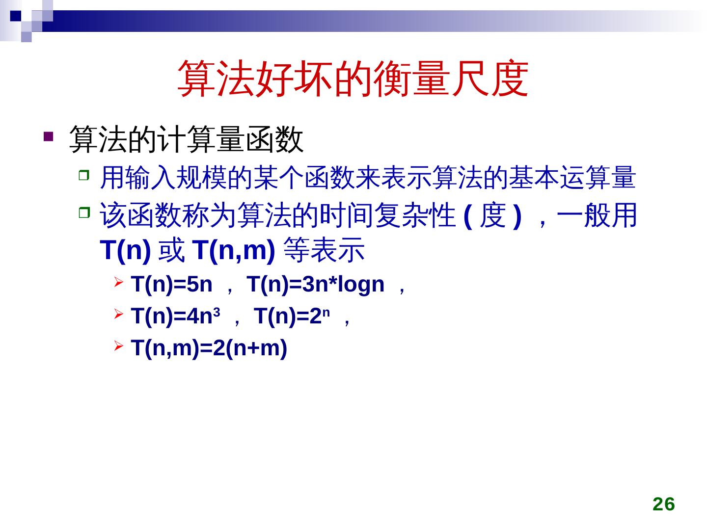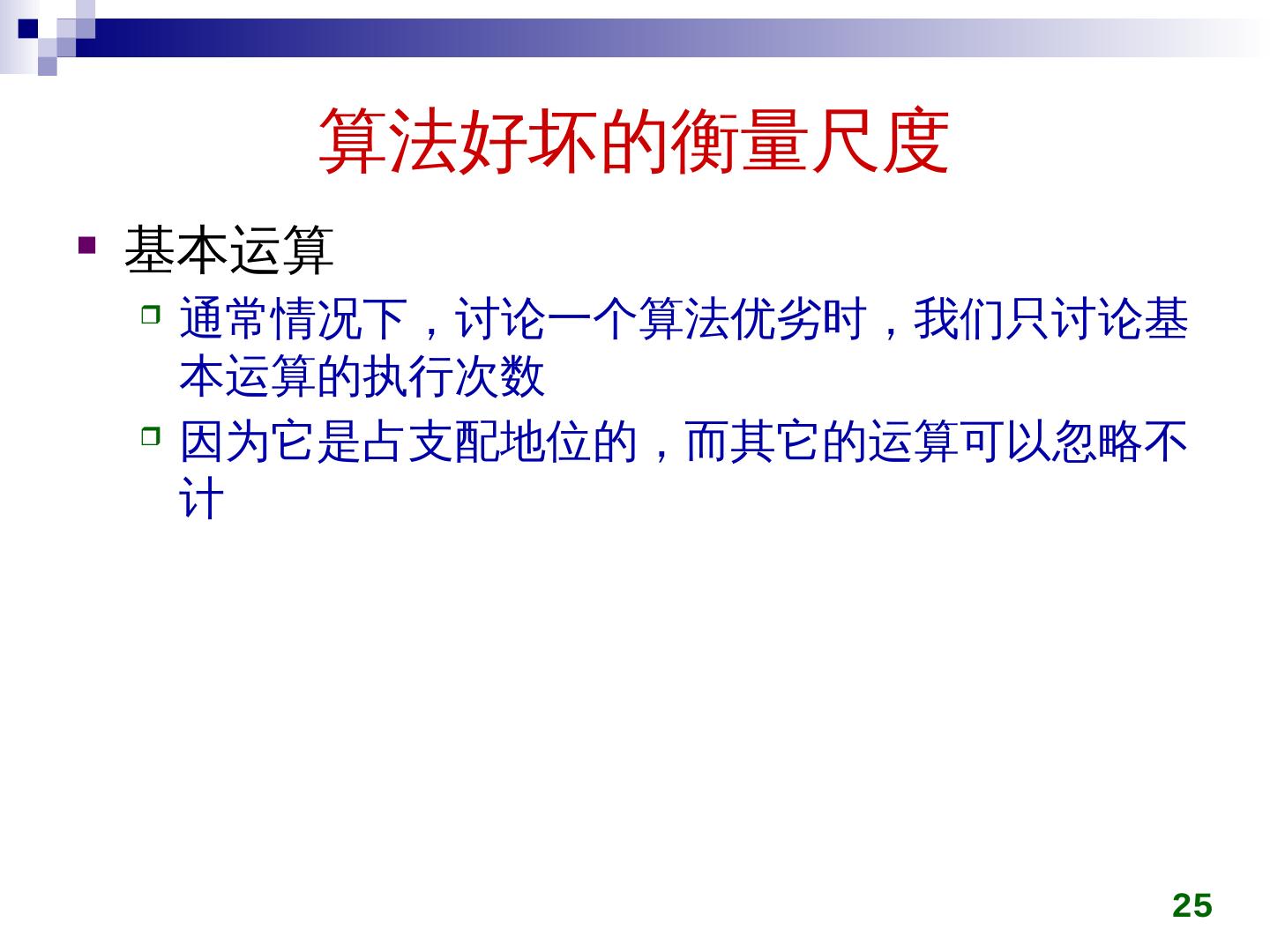 25 .算法好坏的衡量尺度 基本运算 通常情况下,讨论一个算法优劣时,我们只讨论基本运算的执行次数 因为它是占支配地位的,而其它的运算可以忽略不计 25