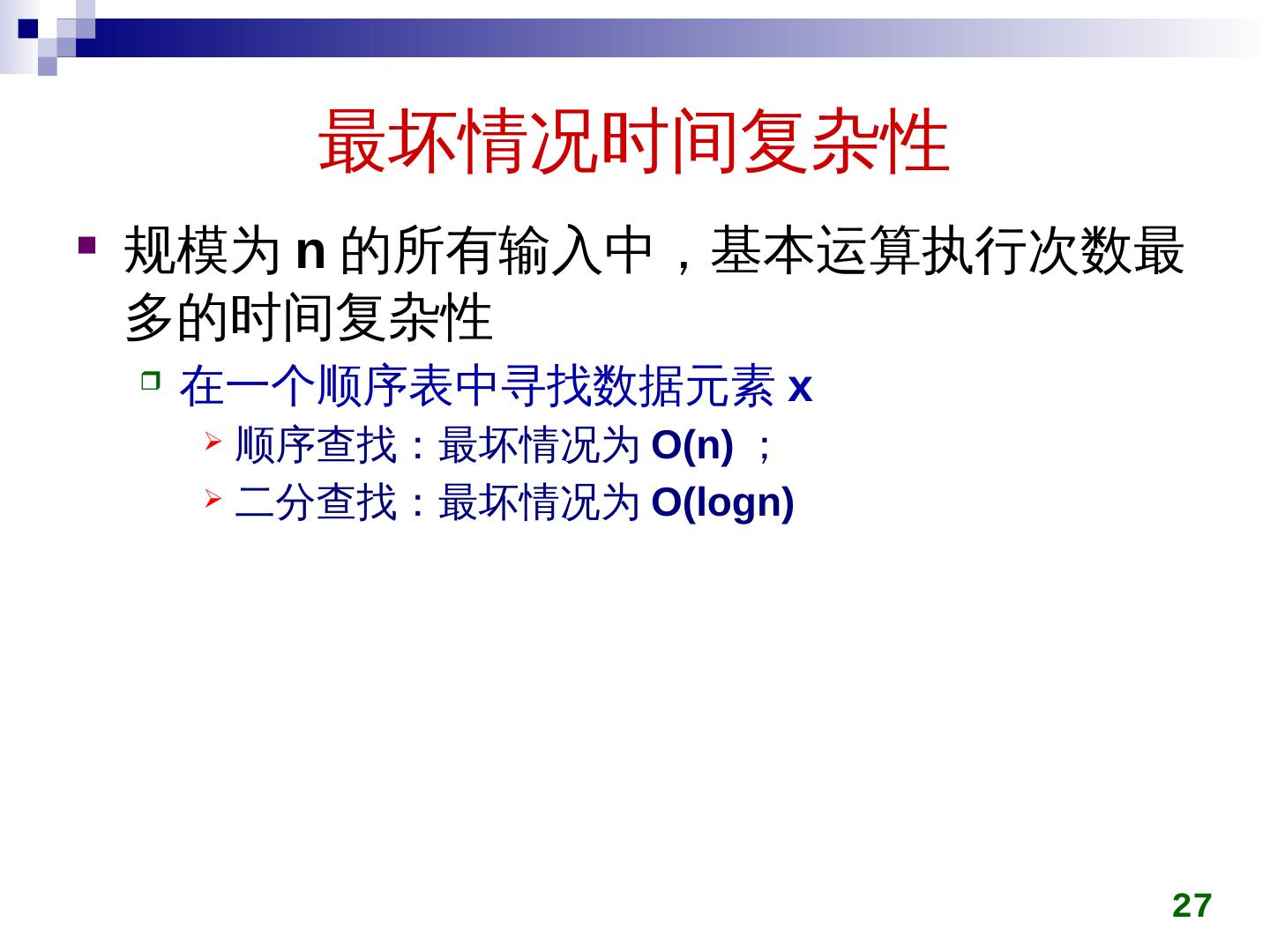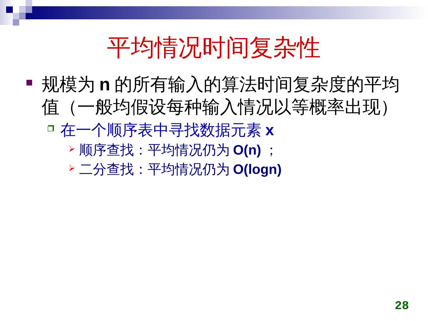 27 .最坏情况时间复杂性 规模为 n 的所有输入中,基本运算执行次数 最多的 时间复杂性 在一个顺序表中寻找数据元素 x 顺序查找:最坏情况为 O(n) ; 二分查找:最坏情况为 O( logn ) 27