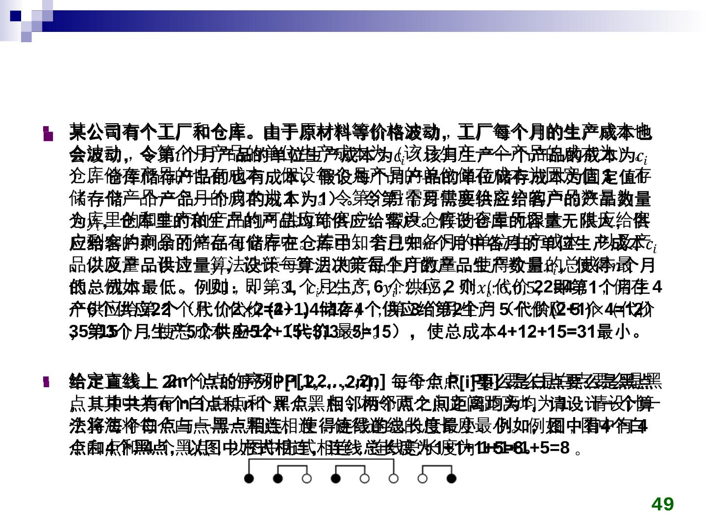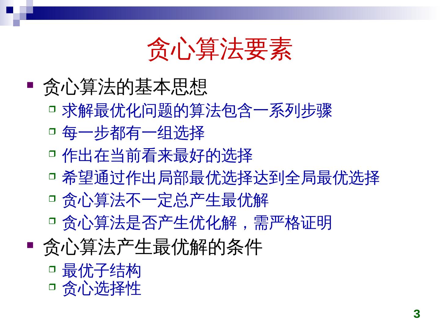 3 .贪心算法要素 贪心算法 的基本思想 求解 最优化问题的算法包含一系列 步骤 每 一步都有一组 选择 作出 在当前看来最好的 选择 希望 通过作出 局部最优选择 达到 全局 最优 选择 贪心算法 不一定总产 生最优解 贪心算法 是否产生优化解,需严格 证明 贪心算法产生最优解的条件 最优子结构 贪心选择性 3