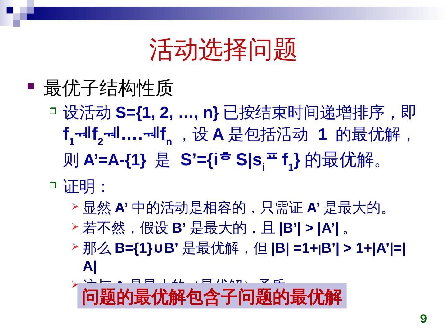 9 .活动选择问题 最优子结构性质 设活动 S ={1, 2, …, n } 已按结束时间递增排序 , 即 f 1 f 2 …. f n ,设 A 是包括活动 1 的最优解,则 A’=A-{1} 是 S ’ ={i S|s i f 1 } 的最优解。 证明: 显然 A’ 中的活动是相容的,只需证 A’ 是最大的。 若不然,假设 B’ 是最大的,且 | B’| > | A’| 。 那么 B={1}∪B ’ 是最优解,但 |B| =1+ | B’| > 1+| A’|=| A| 这与 A 是最大的(最优解)矛盾。 9 问题的最优解包含子问题的最优解