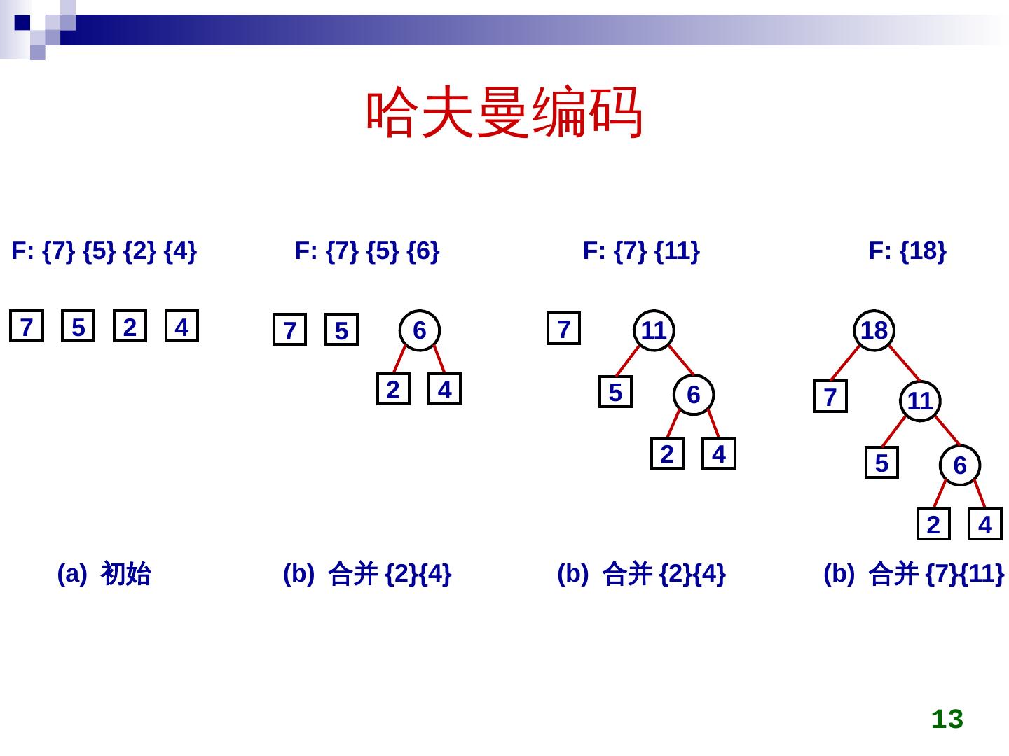 13 .哈夫曼编码 13 F: {7} {5} {2} {4} 7 5 2 4 (a) 初始 F: {7} {5} {6} (b) 合并 {2}{4} F: {7} {11} (b) 合并 {2}{4} F: {18} (b) 合并 {7}{11} 6 7 5 2 4 6 7 5 2 4 11 6 7 5 2 4 11 18