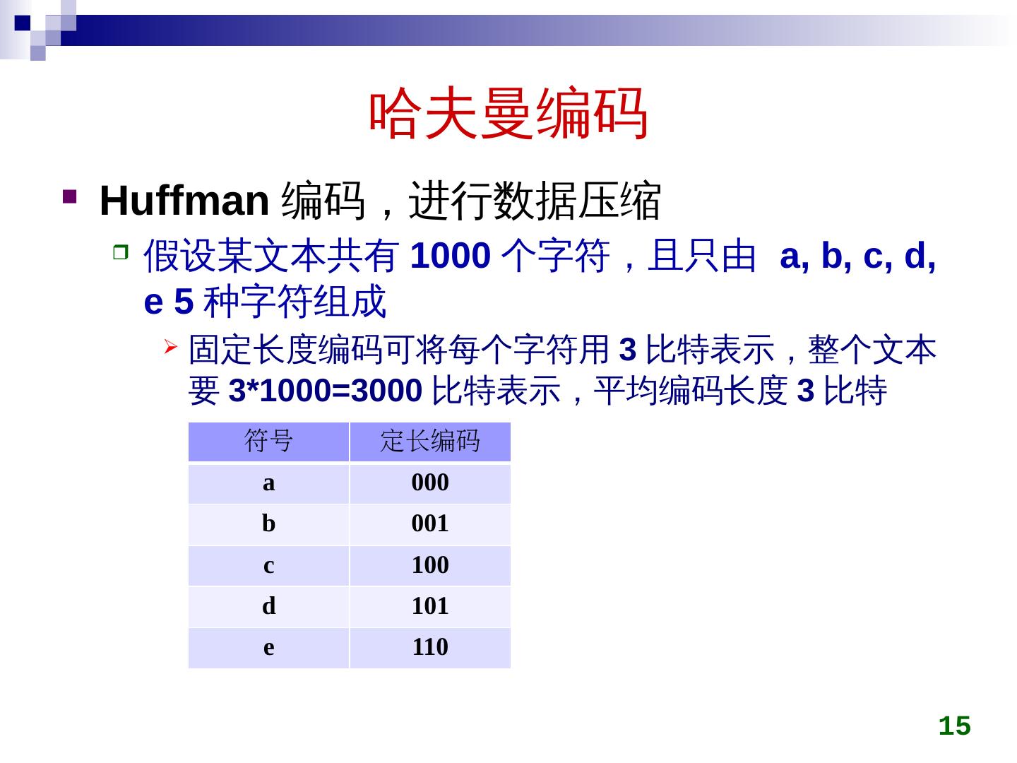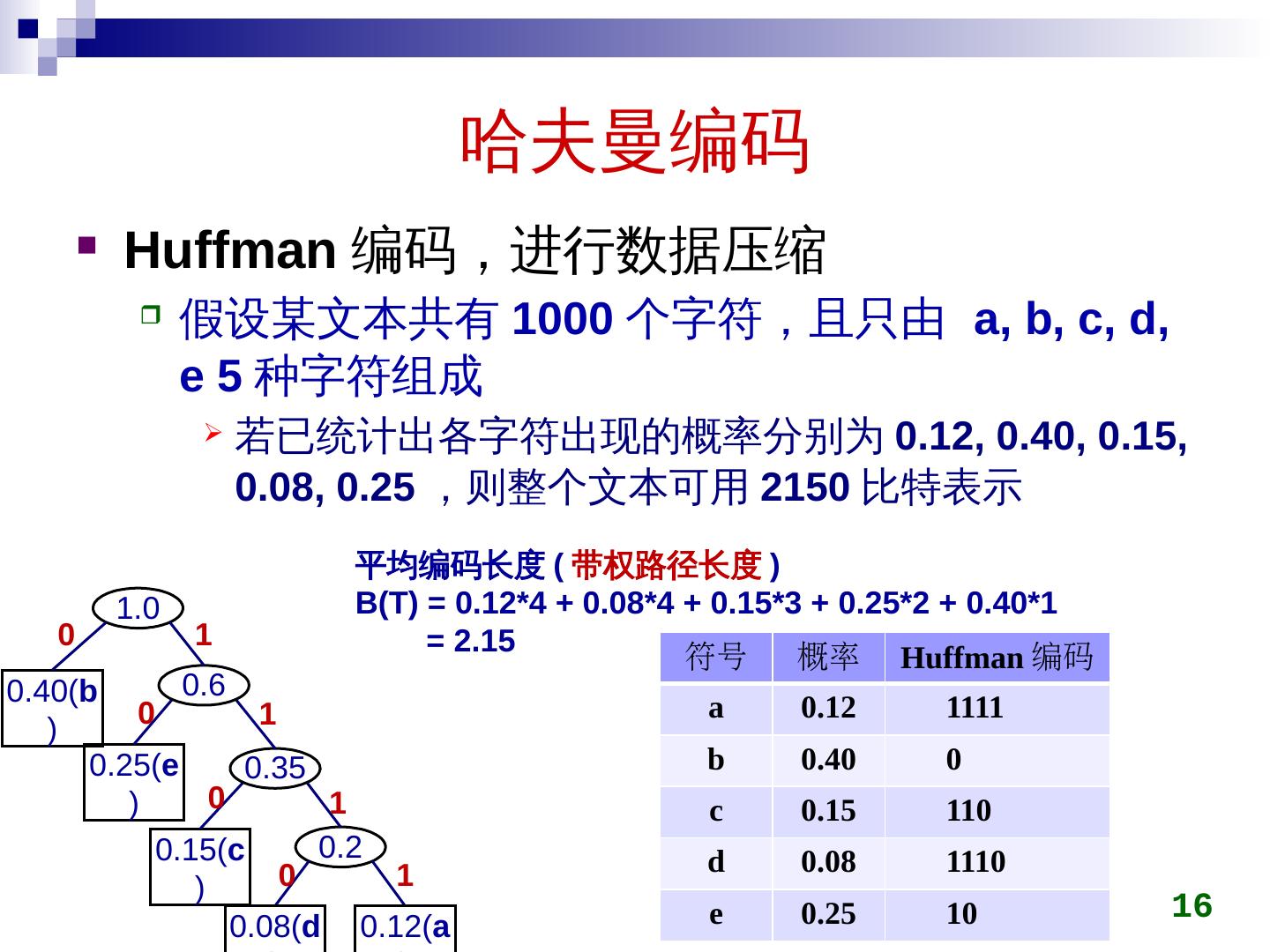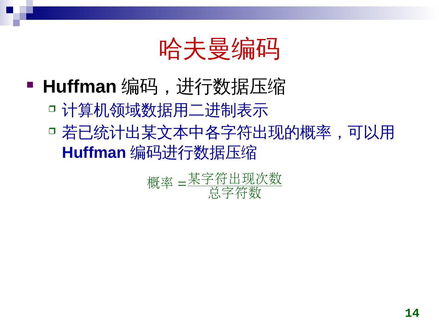 14 .哈夫曼编码 Huffman 编码,进行数据压缩 计算机领域数据用二进制表示 若已统计出某文本中各字符出现的概率,可以用 Huffman 编码进行数据压缩 14
