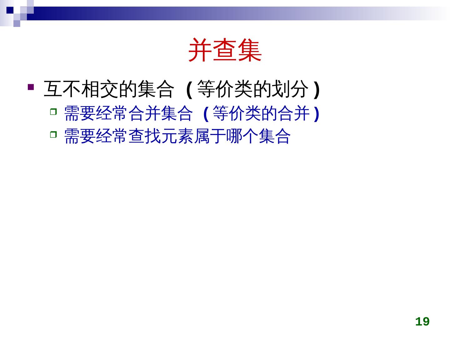 19 .并查集 互不相交的集合 ( 等价类的划分 ) 需要经常合并集合 ( 等价类的合并 ) 需要经常查找元素属于哪个集合 19