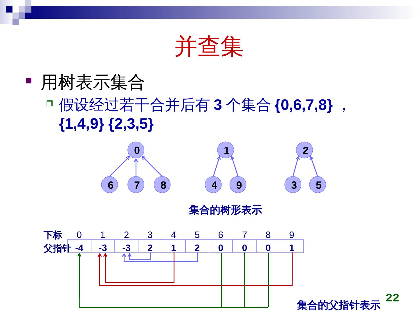 22 .并查集 用树表示集合 假设经过若干合并后有 3 个集合 {0,6,7,8} , {1,4,9} {2,3,5} 22 8 6 7 0 集合的树形表示 集合的父指针表示 2 3 5 1 4 9 下标 父指针 2 3 4 5 6 7 1 0 8 9 -3 2 1 2 0 0 -3 -4 0 1