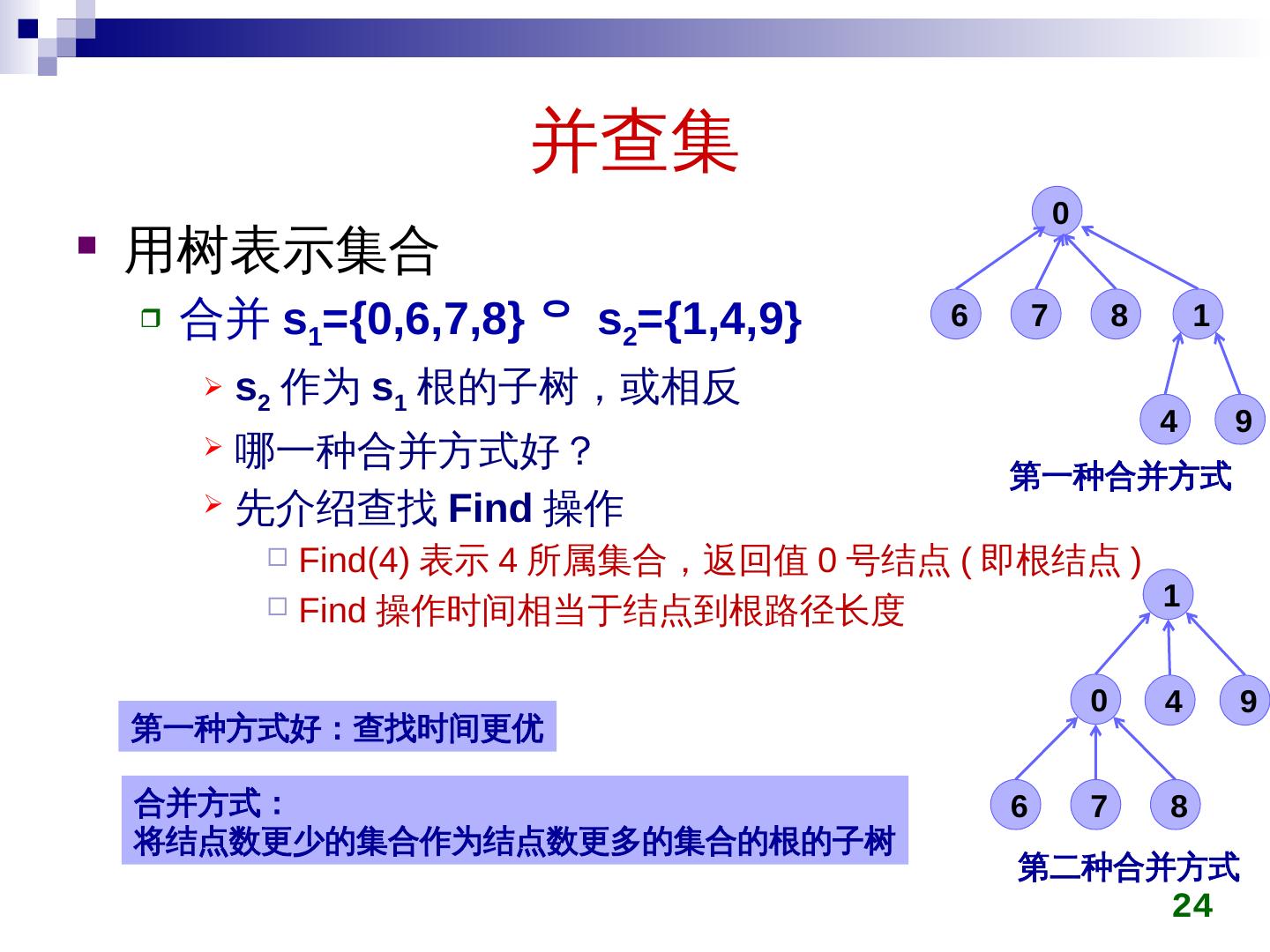 23 .并查集 用树表示集合 合并 s 1 ={0,6,7,8} s 2 = {1,4,9} s 2 作为 s 1 根的子树,或相反 23 8 6 7 0 合并集合 8 1 6 7 4 9 0 8 1 6 7 4 9 0 第一种合并方式 第二种合并方式 1 4 9 第一种合并的父指针表示 下标 父指针 2 3 4 5 6 7 1 0 8 9 -3 2 0 2 0 0 0 -7 0 0