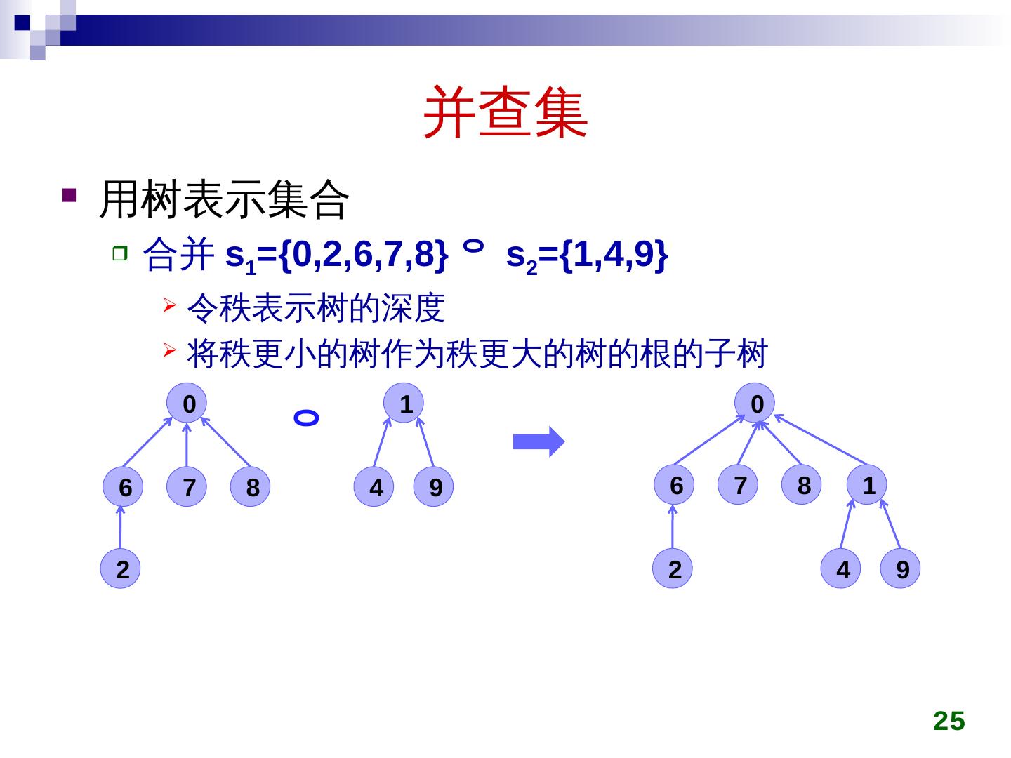 24 .并查集 用树表示集合 合并 s 1 ={0,6,7,8} s 2 = {1,4,9} s 2 作为 s 1 根的子树,或相反 哪一种合并方式好? 先介绍查找 Find 操作 Find(4) 表示 4 所属集合,返回值 0 号结点 ( 即根结点 ) Find 操作时间相当于结点到根路径长度 24 8 1 6 7 4 9 0 8 1 6 7 4 9 0 第一种合并方式 第二种合并方式 第一种方式好:查找时间更优 合并方式: 将结点数更少的集合作为结点数更多的集合的根的子树