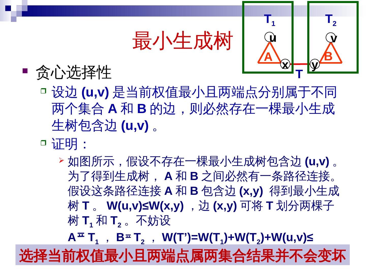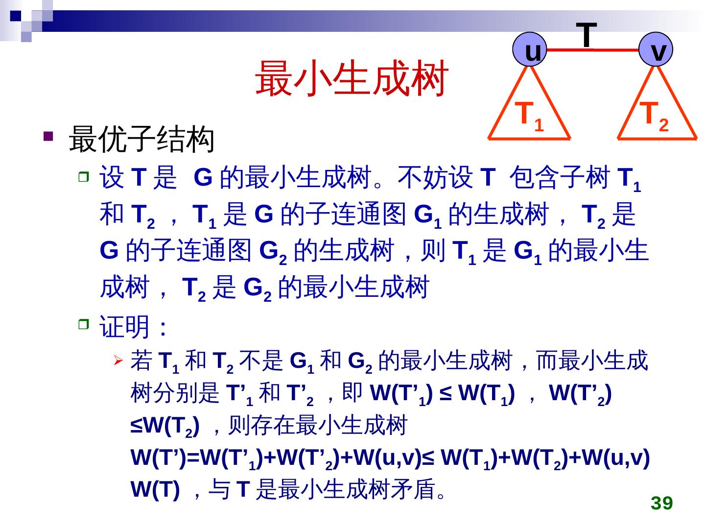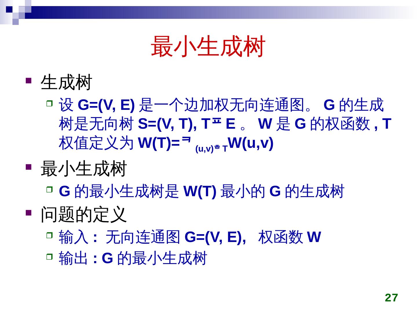 27 .最小生成树 生成树 设 G=(V, E) 是一个边加权无向连通图。 G 的生成树是无向树 S=(V, T), T E 。 W 是 G 的权函数 , T 权 值 定义为 W(T )= ( u,v )T W( u,v ) 最小生成树 G 的最小生成树是 W(T) 最小的 G 的生成树 问题 的 定义 输入 : 无向连通图 G=(V, E), 权函数 W 输出 : G 的最小生成树 27