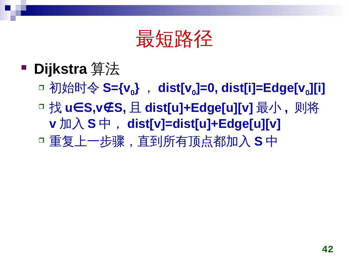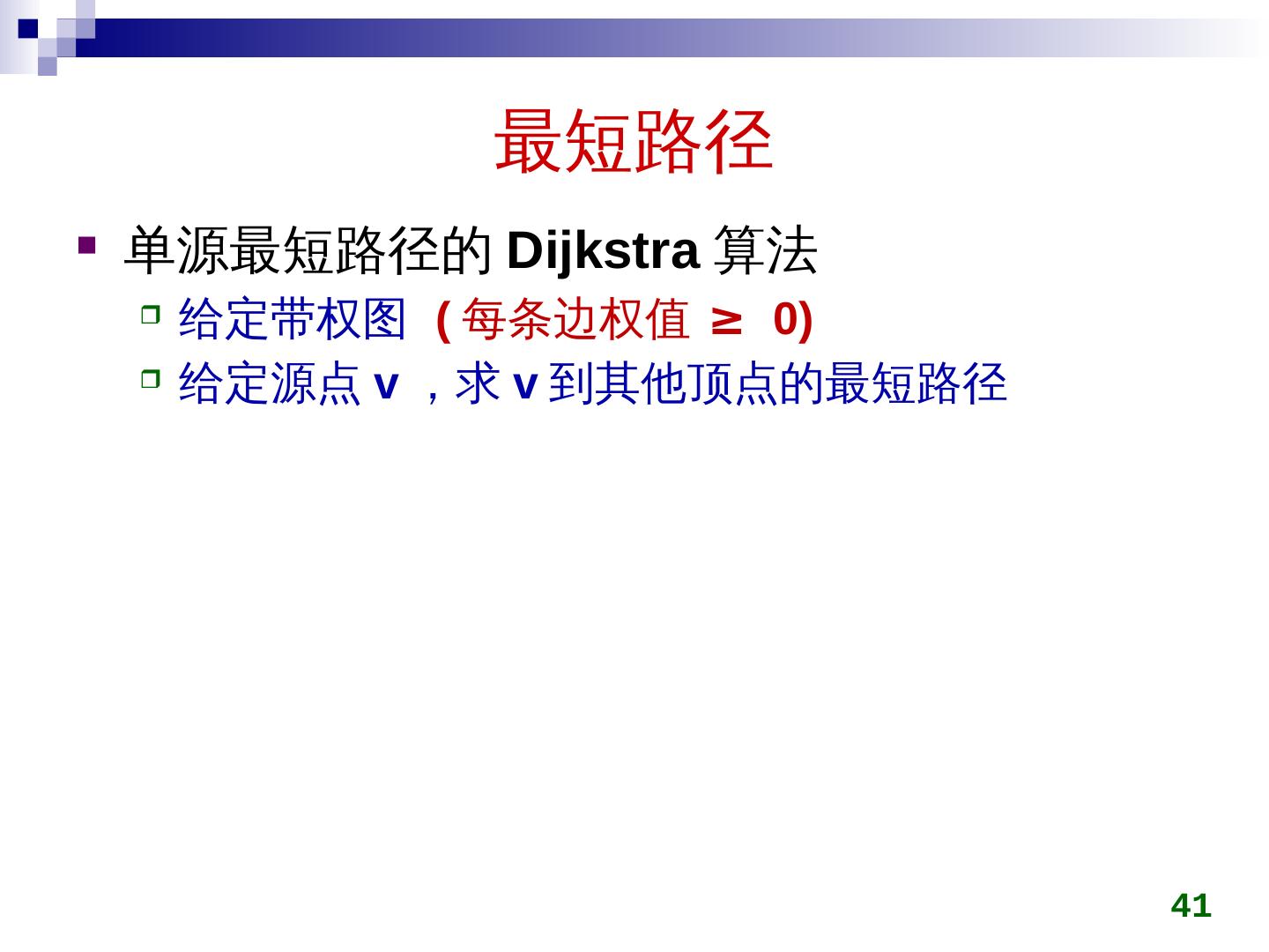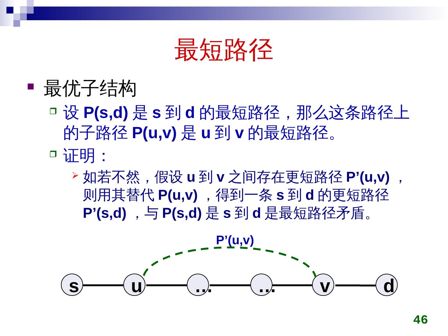 27 .最小生成树 生成树 设 G=(V, E) 是一个边加权无向连通图。 G 的生成树是无向树 S=(V, T), T E 。 W 是 G 的权函数 , T 权 值 定义为 W(T )= ( u,v )T W( u,v ) 最小生成树 G 的最小生成树是 W(T) 最小的 G 的生成树 问题 的 定义 输入 : 无向连通图 G=(V, E), 权函数 W 输出 : G 的最小生成树 27