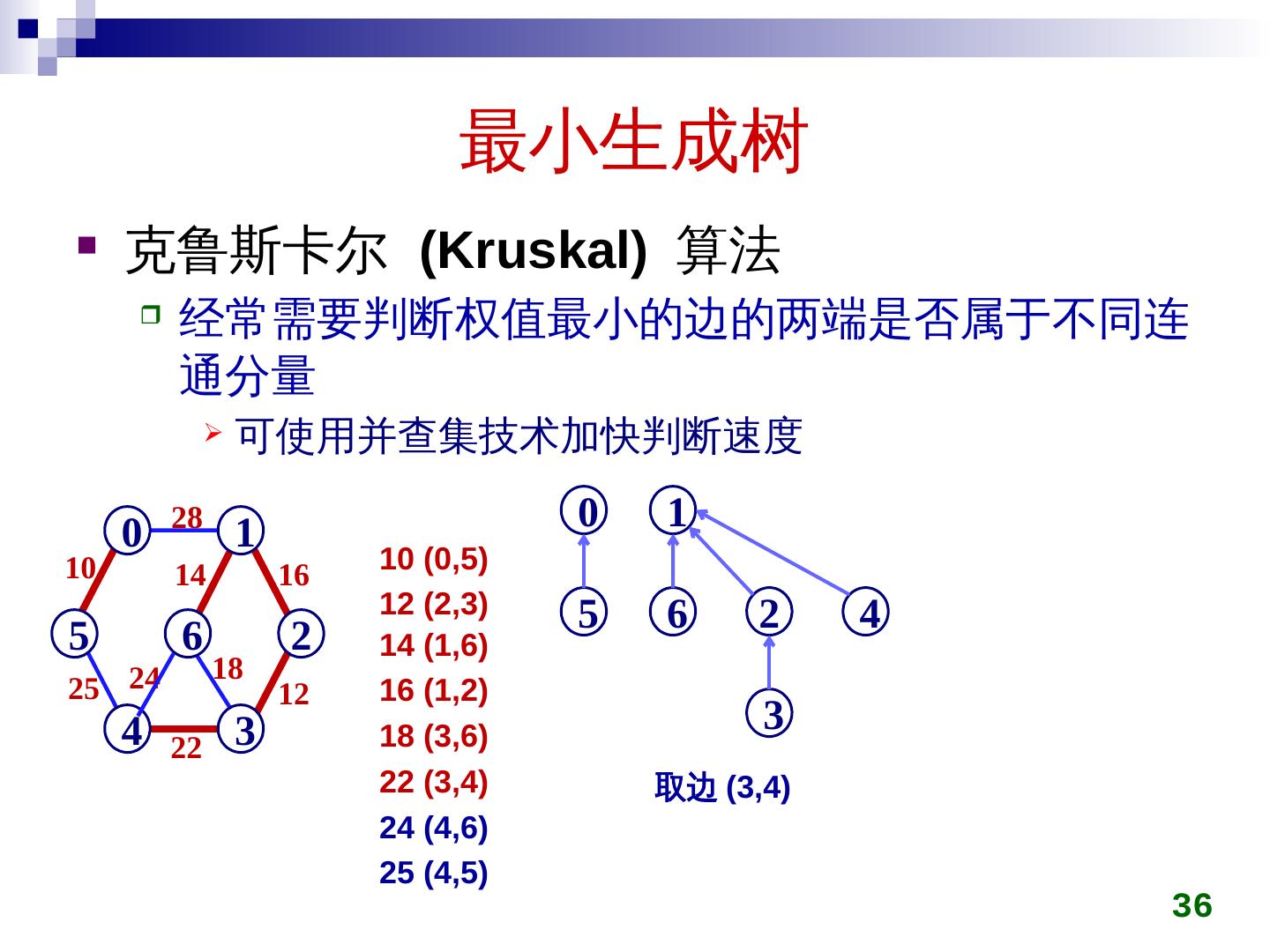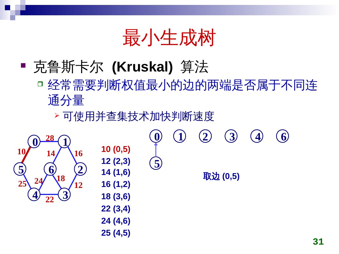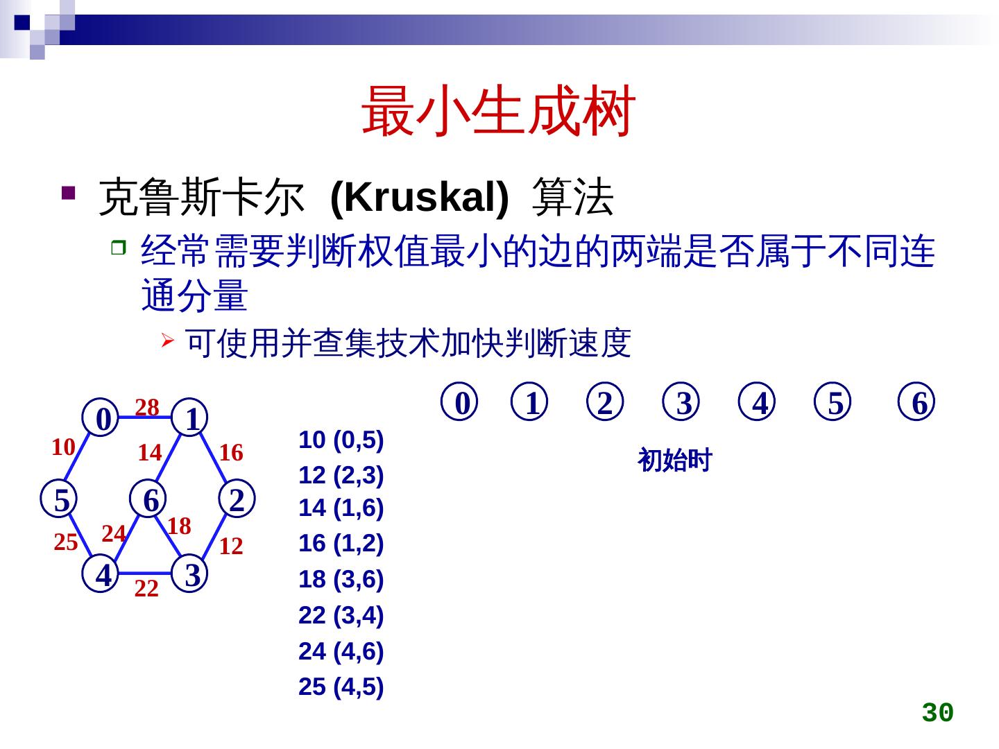 29 .最小生成树 克鲁斯卡尔 (Kruskal) 算法 29 28 5 0 4 6 1 3 2 10 25 14 24 22 16 18 12 5 0 4 6 1 3 2 5 0 4 6 1 3 2 10 5 0 4 6 1 3 2 10 12 5 0 4 6 1 3 2 10 14 12 5 0 4 6 1 3 2 10 14 16 12 5 0 4 6 1 3 2 10 14 22 16 12 5 0 4 6 1 3 2 10 25 14 22 16 12