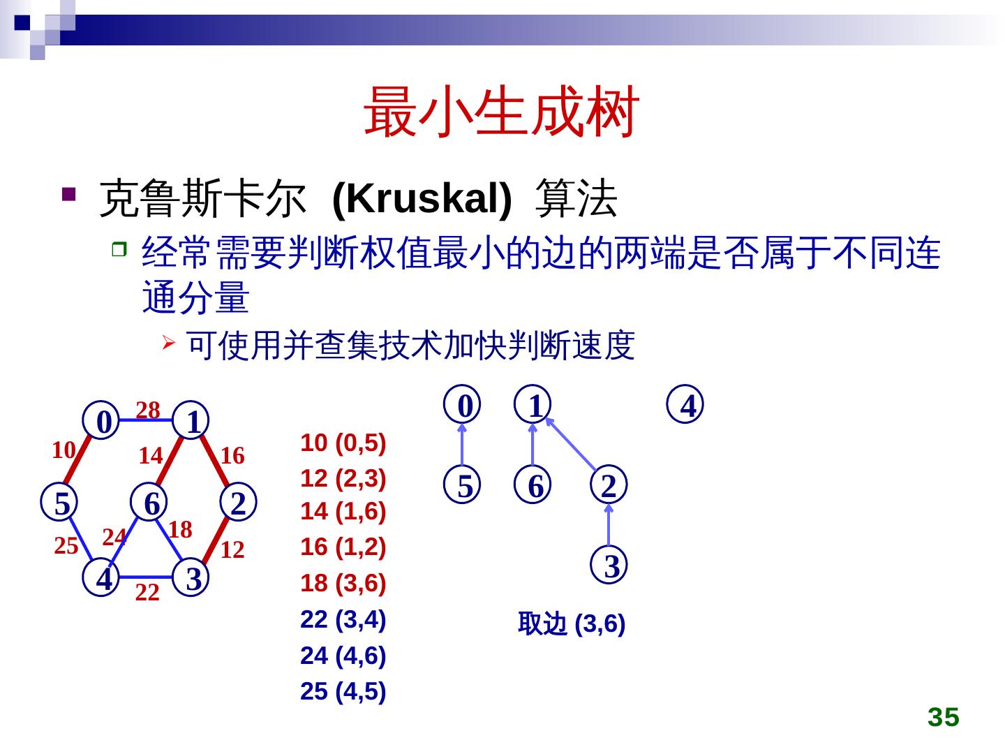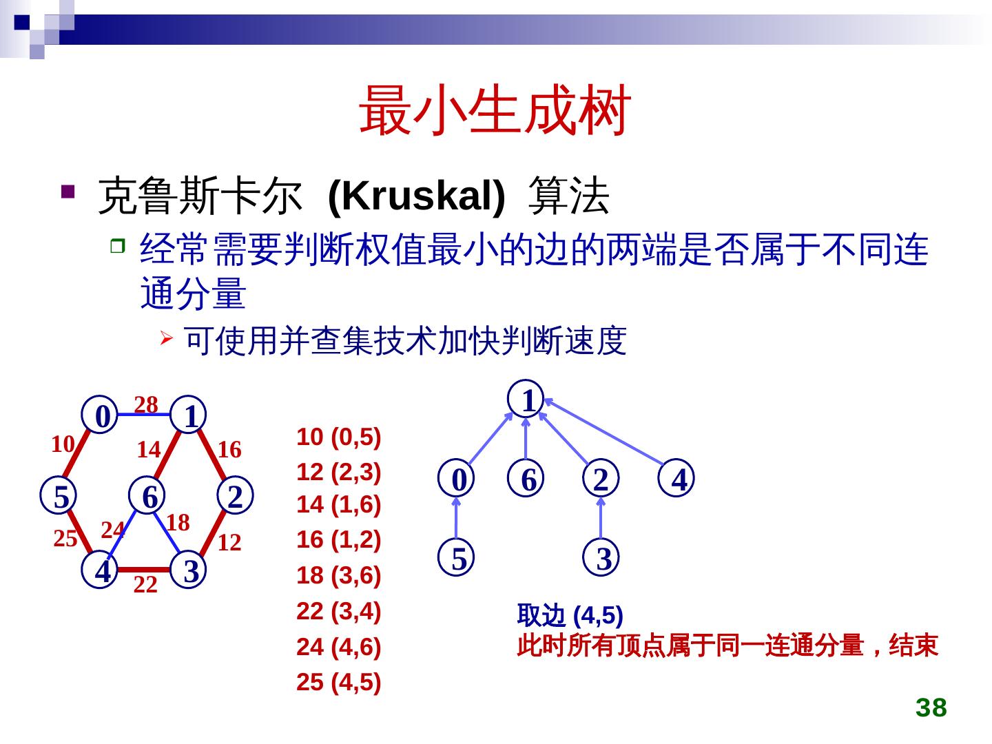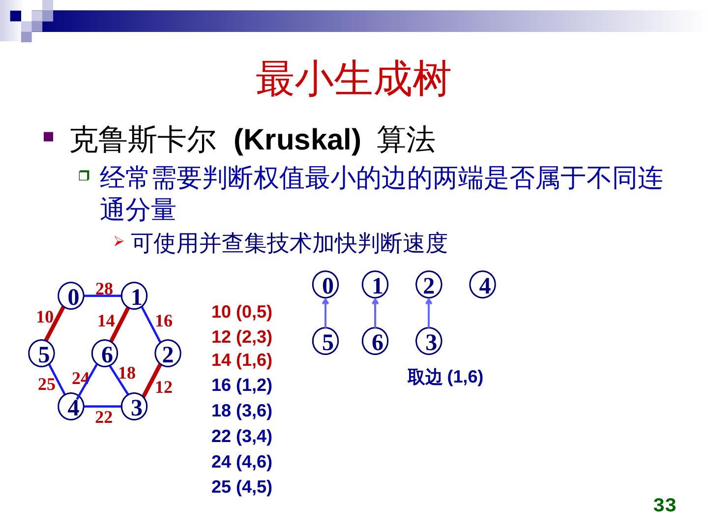 28 .最小生成树 克鲁斯卡尔 ( Kruskal ) 算法 初始时所有顶点自成一集合 在图上选权值最小的边 e min ,判断 e min 两端点是否属于不同集合 c i ,c j 若是,将 c i ,c j 用 e min 连接成同一个集合 否则,舍弃 e min 重复上一过程,直到所有顶点在同一集合 28