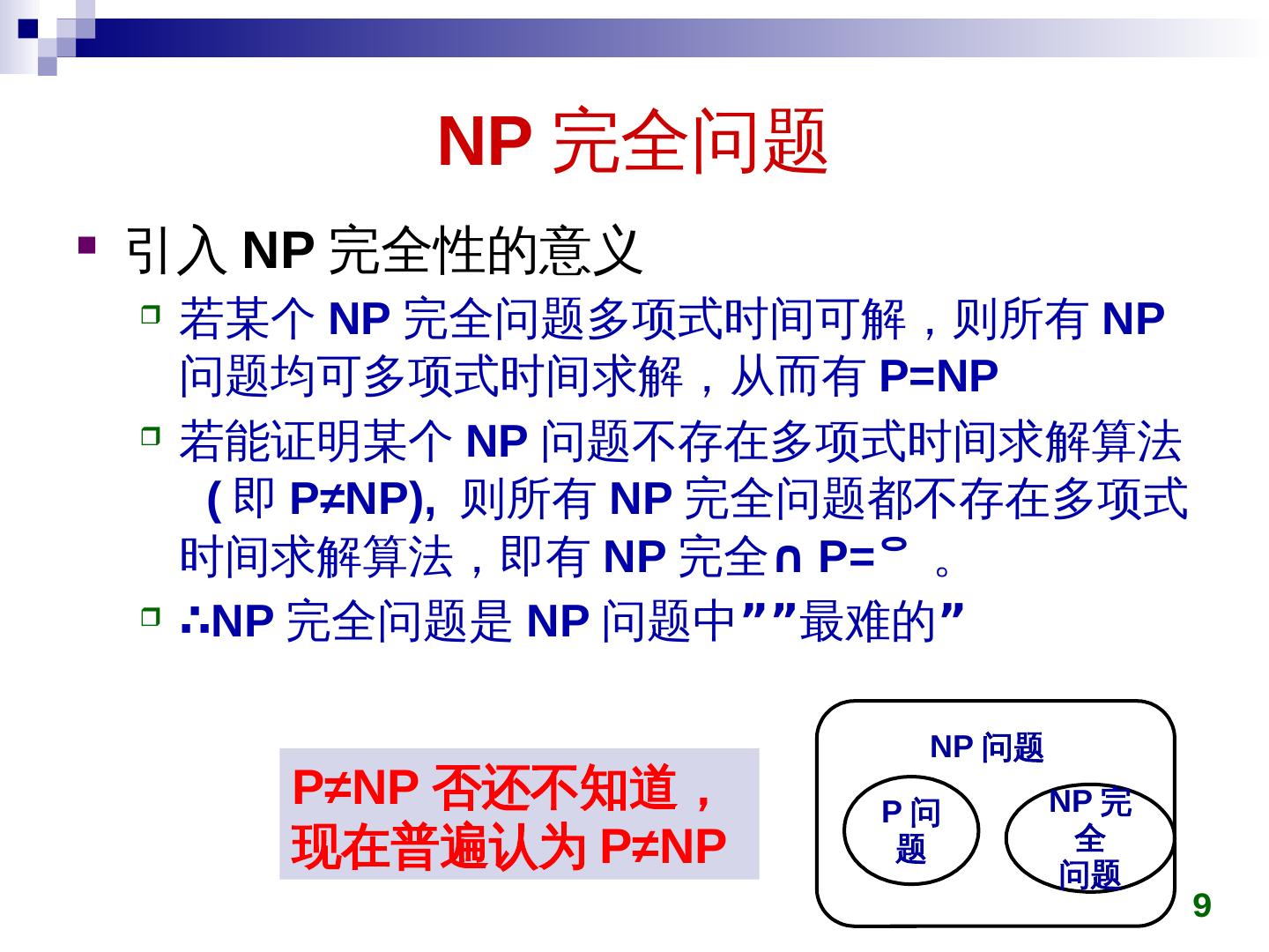 8 .NP 完全问题 问题 A 是一个 NP 完全问题,则有 A ∈ NP 问题 ( 多项式时间可 验证 解是否正确 ) 且 B ∈ NP,B ≤ p A 任意 NP 问题 B 都 可多项式时间归约到 A 构造一个多项式时间对应关系 8 NP 问题 P 问题 N P 完全 问题 P ≠ NP 否还不知道, 现在普遍认为 P≠NP