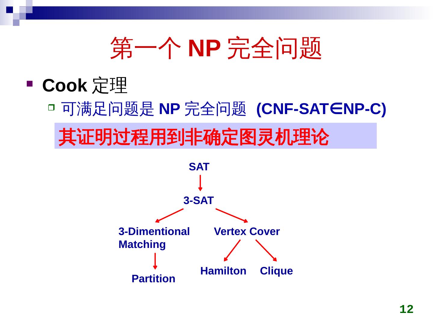 12 .第一个 NP 完全问题 Cook 定理 可满足问题是 NP 完全问题 (CNF-SAT ∈ NP-C) 12 其证明过程用到非确定图灵机 理论 SAT 3-SAT 3-Dimentional Matching Partition Vertex Cover Hamilton Clique