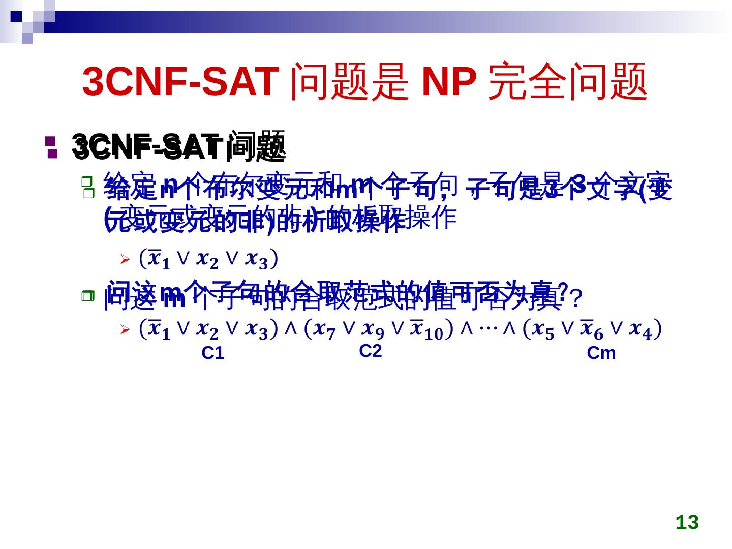 11 .第一个 NP 完全问题 CNF-SAT 问题 ( 可满足问题 ) 给定 n 个 布尔变量 ,和 m 个 子句, 子句 是 1 个或多个个 文字 ( 变量或变量的 非 ) 的析取操作 如: , 给定这 m 个子句的 合取范式 问该合取范式的值可否为真? 11