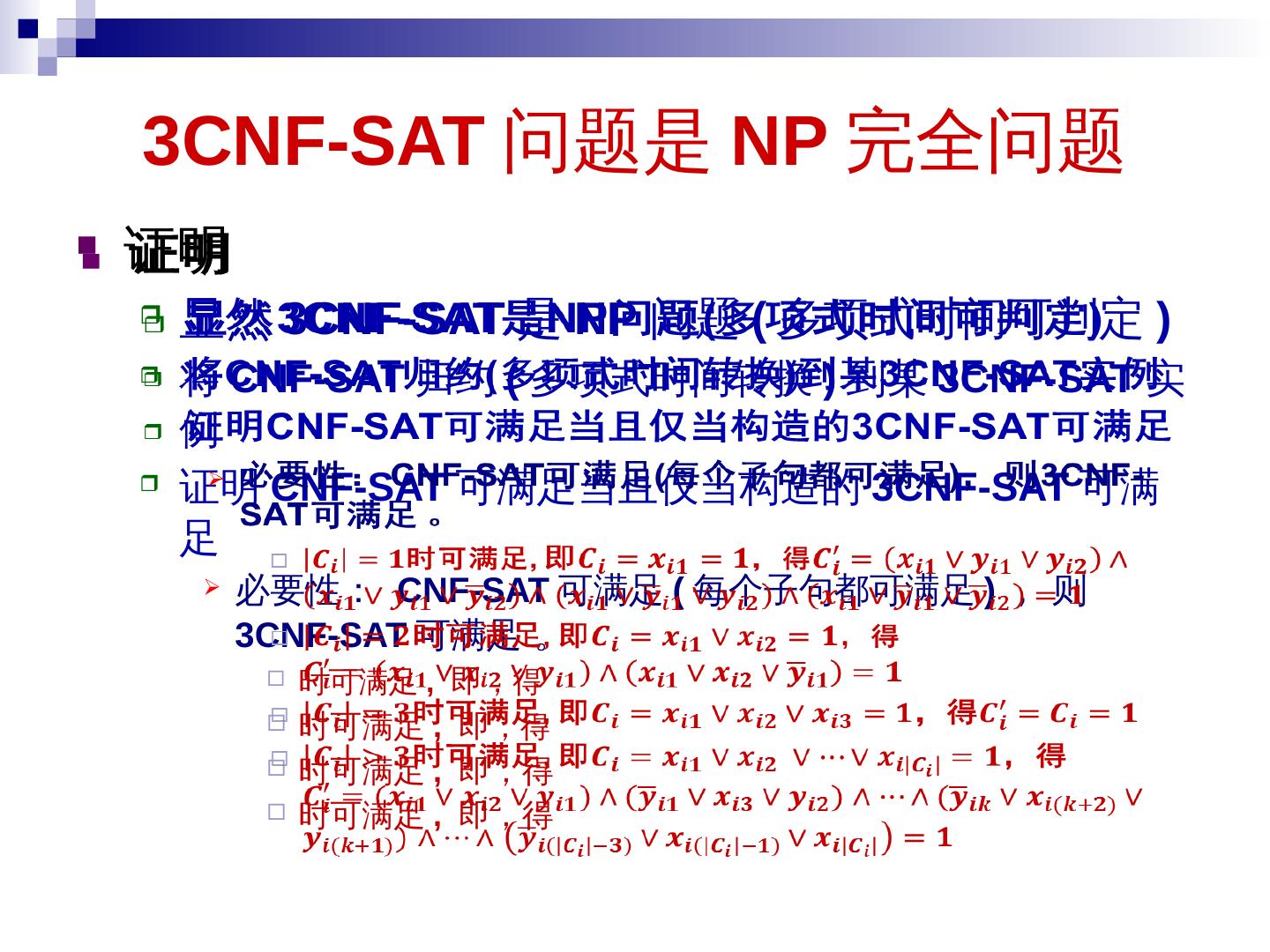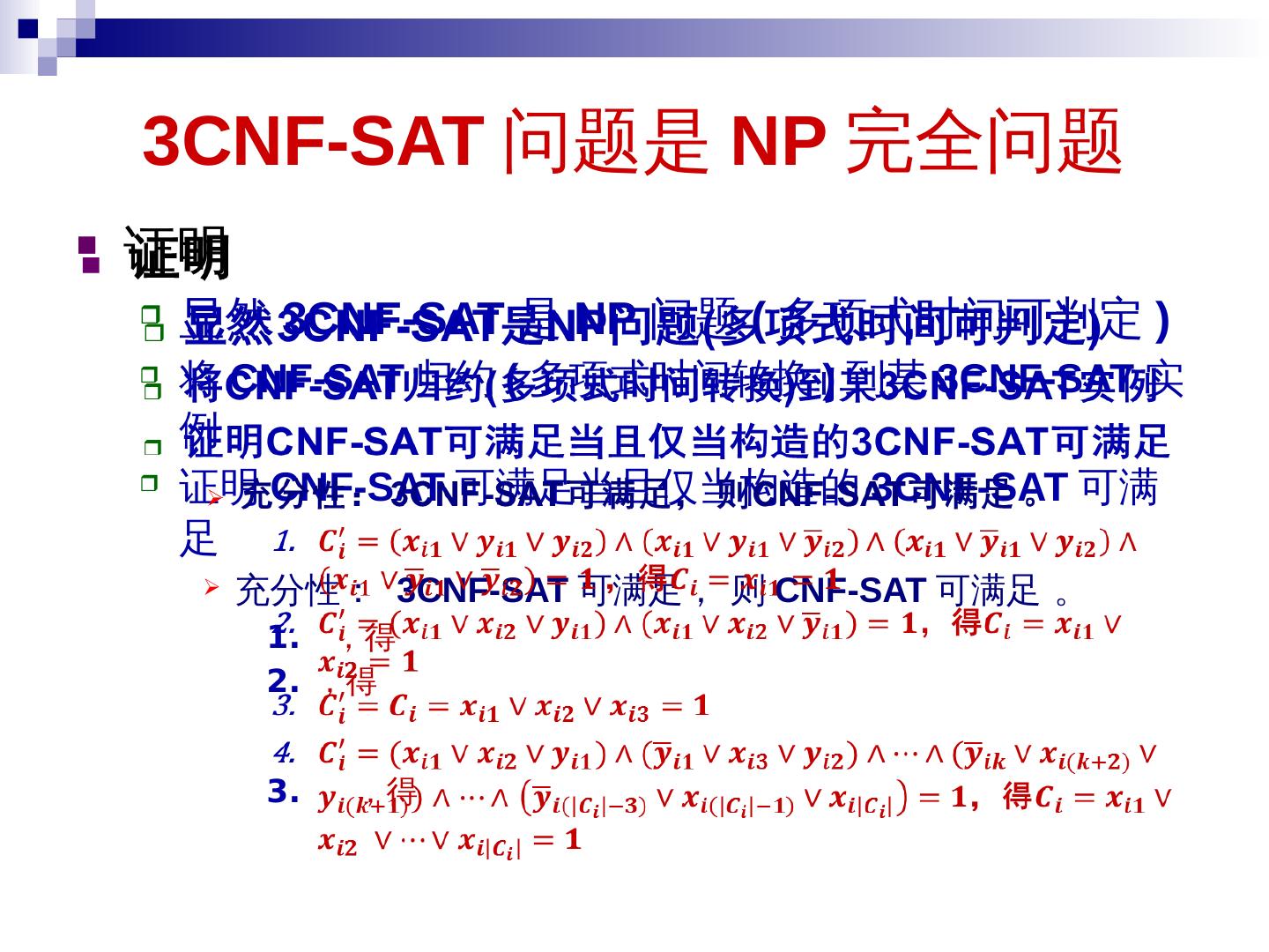 15 .3CNF-SAT 问题是 NP 完全问题 证明 显然 3CNF-SAT 是 NP 问题 ( 多项式时间可判定 ) 将 CNF-SAT 归约 ( 多项式时间转换 ) 到某 3CNF-SAT 实例 证明 CNF-SAT 可满足当且仅当构造的 3CNF-SAT 可满足 必要性: CNF-SAT 可 满足 ( 每个 子句都可 满足 ) , 则 3CNF-SAT 可满足 。 时可满足 , 即 ,得 时可满足 , 即 ,得 时可满足 , 即 ,得 时可满足 , 即 ,得
