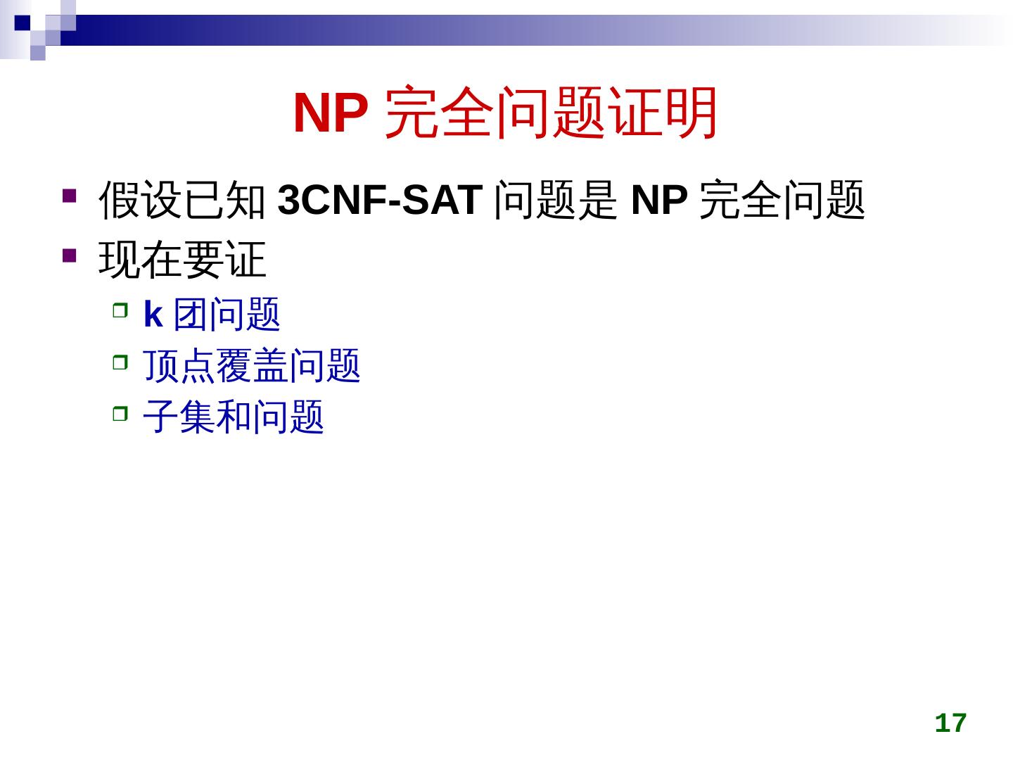 17 .NP 完全问题证明 假设已知 3CNF-SAT 问题是 NP 完全问题 现在要证 k 团问题 顶点覆盖问题 子集和问题 17